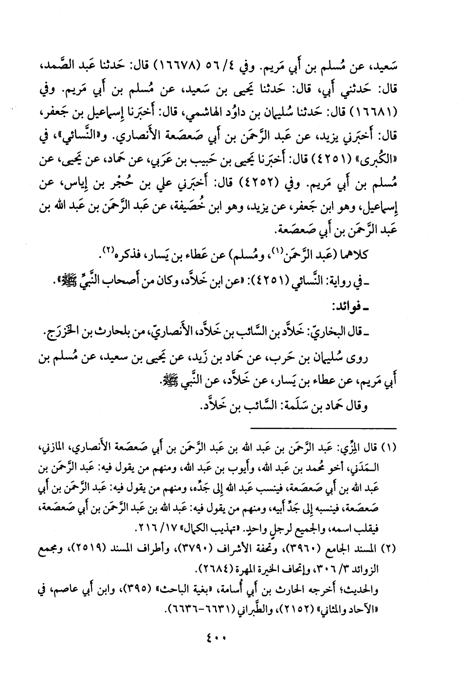 و «النَّسَائي» في «الكبرى» (٤٢٥١) قال: أخبرنا يحيى بن حبيب بن عربي، عن حماد، عن يحيى، عن مسلم بن أبي مريم. وفي (٤٢٥٢) قال: أخبرني علي بن حُجْر بن إياس، عن إسماعيل، وهو ابن جعفر، عن يزيد، وهو ابن خصيفة، عن عبد الرَّحمَن بن عبد الله بن عبد الرَّحمَن بن أبي صعصعة.