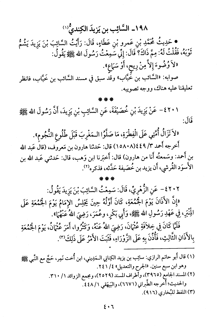 (¬١) قال أَبو حاتم الرازي: سائب بن يزيد الكناني المديني، ابن أخت نمر، حج مع النبي صَلى الله عَليه وسَلم وهو ابن سبع سنين. «الجرح والتعديل» ٤/ ٢٤١.