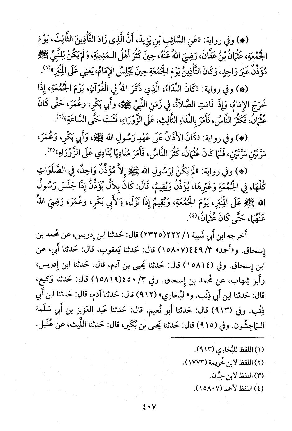 - وفي رواية: «لم يكن لرسول الله صَلى الله عَليه وسَلم إلا مؤذن واحد، في الصلوات كلها، في الجمعة وغيرها، يؤذن ويقيم، قال: كان بلال يؤذن إذا جلس رسول الله صَلى الله عَليه وسَلم على المنبر، يوم الجمعة، ويقيم إذا نزل، ولأَبي بكر، وعمر، رضي الله عنهما، حتى كان عثمان» (¬١).