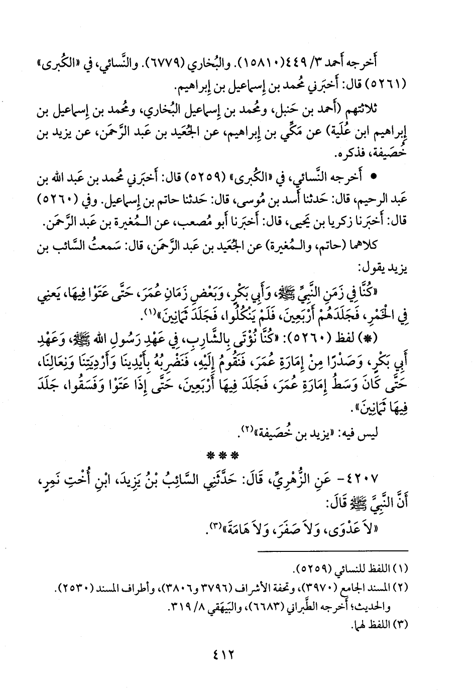 - لفظ (٥٢٦٠): «كنا نؤتى بالشارب، في عهد رسول الله صَلى الله عَليه وسَلم وعهد أَبي بكر، وصدرا من إمارة عمر، فنقوم إليه، فنضربه بأيدينا وأرديتنا ونعالنا، حتى كان وسط إمارة عمر، فجلد فيها أربعين، حتى إذا عتوا وفسقوا، جلد فيها ثمانين».