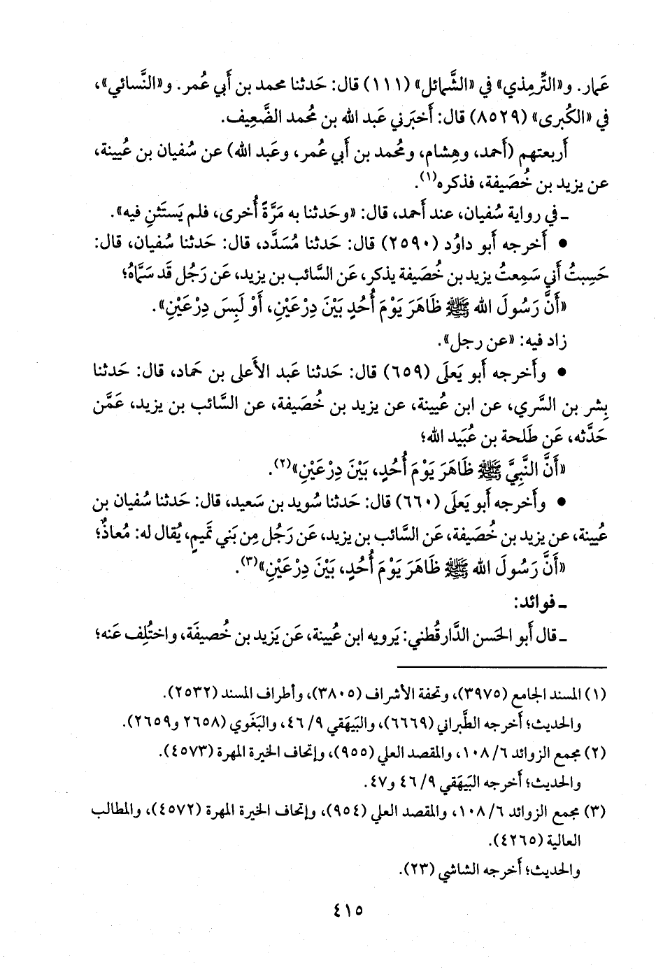 وخالفه أصحاب ابن عُيينة، فرووه عنه، عن يزيد بن خصيفة، عن السائب، أن النبي صَلى الله عَليه وسَلم ظاهر، ولم يذكروا فوق السائب أحدا.