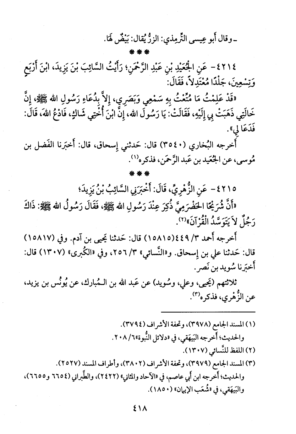 ٤٢١٥ - عن محمد بن مسلم بن شهاب الزُّهْري، قال: أخبرني السائب بن يزيد؛