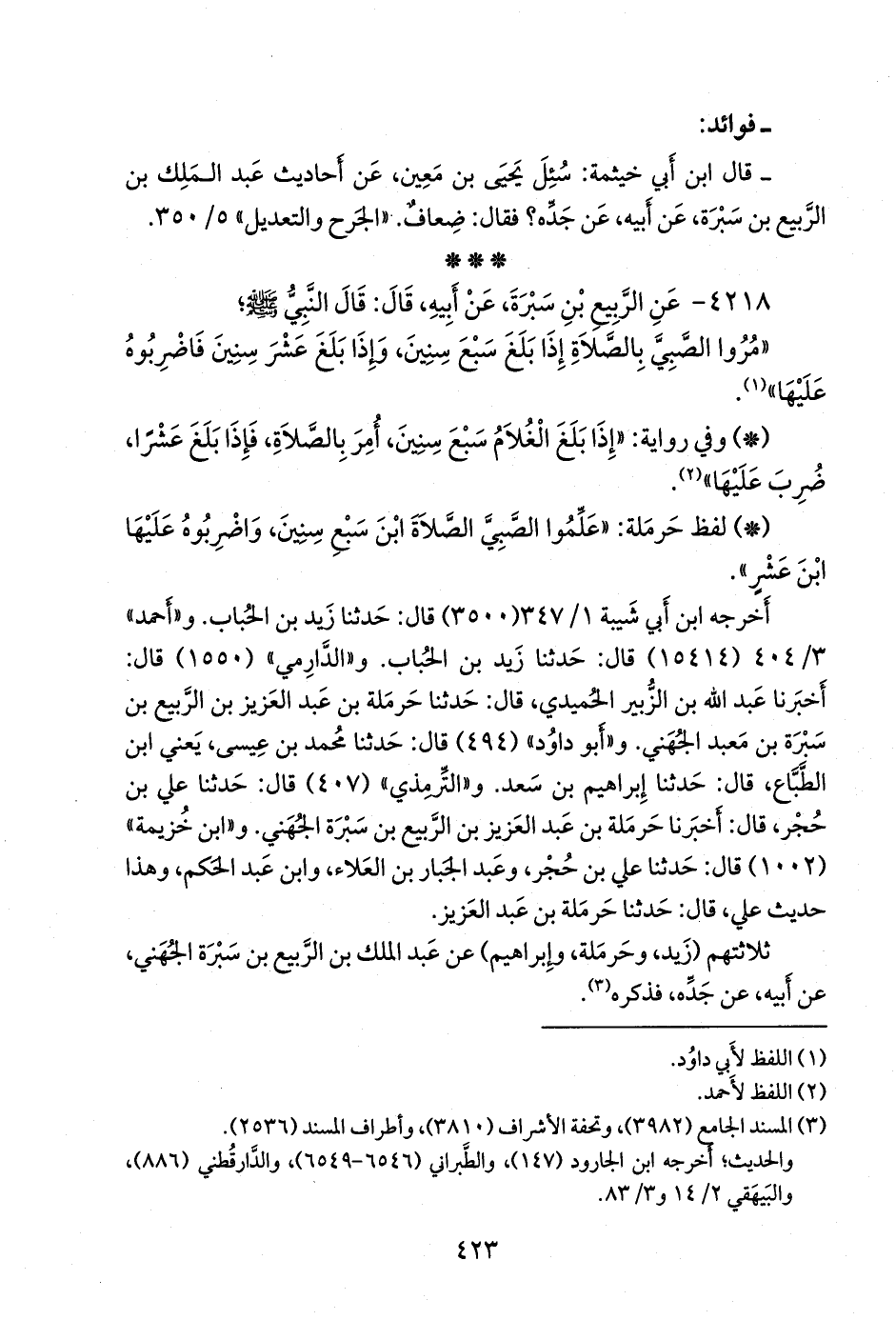 - قلنا: إسناده ضعيفٌ؛ قال ابن أبي خيثمة: سئل يحيى بن مَعين، عن أحاديث عبد الملك بن الربيع بن سبرة، عن أبيه، عن جَدِّه؟ فقال: ضعاف. «الجرح والتعديل» ٥/ ٣٥٠.