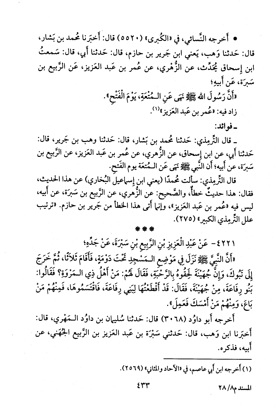 - قال التِّرمِذي: حدثنا محمد بن بشار، قال: حدثنا وهب بن جرير، قال: حدثنا أبي، عن ابن إسحاق، عن الزُّهْري، عن عمر بن عبد العزيز، عن الربيع بن سبرة، عن أبيه؛ أن النبي صَلى الله عَليه وسَلم نهى عن المتعة يوم الفتح.