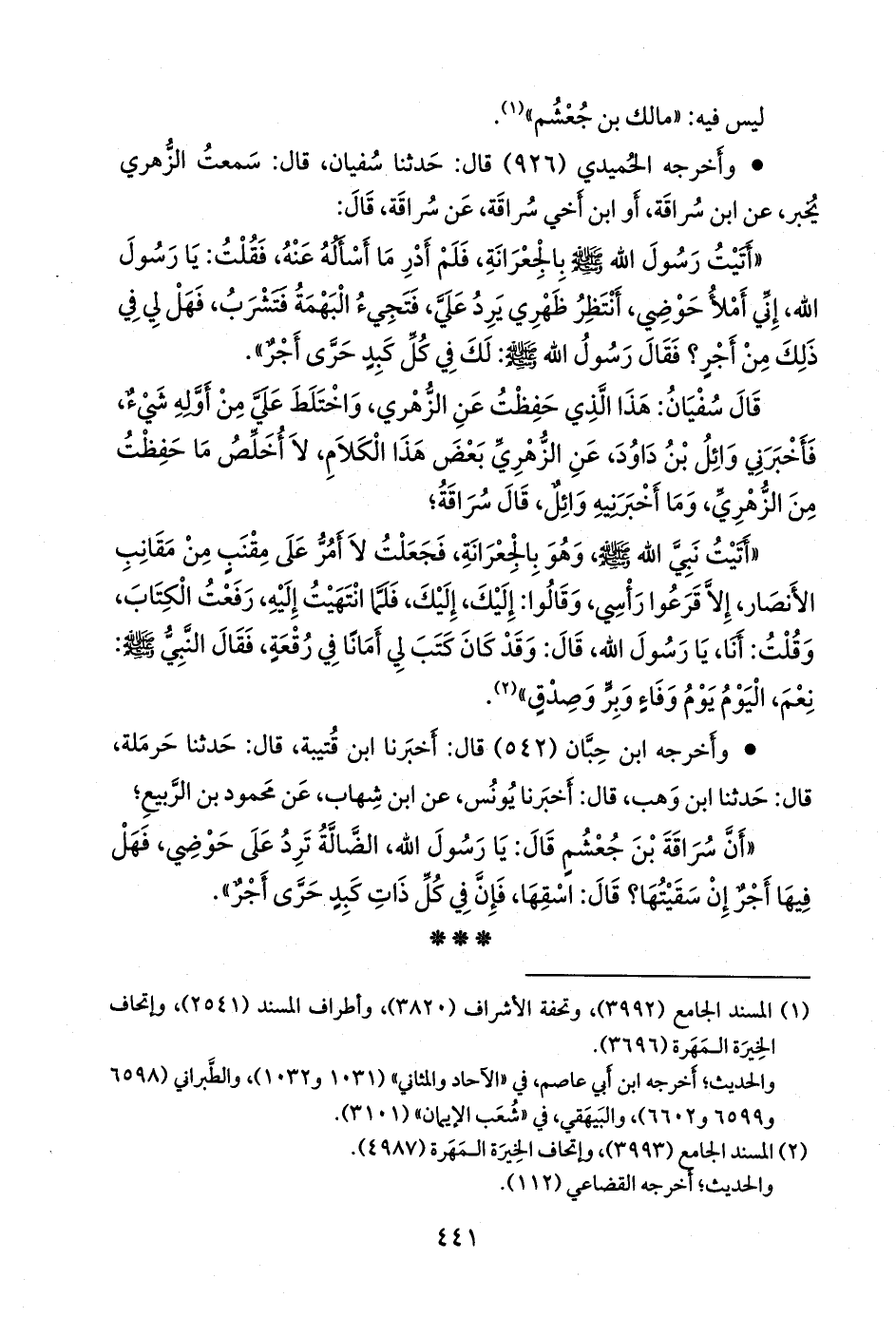 «أن سراقة بن جعشم قال: يا رسول الله، الضالة ترد على حوضي، فهل فيها أجر إن سقيتها؟ قال: اسقها، فإن في كل ذات كبد حرى أجر».