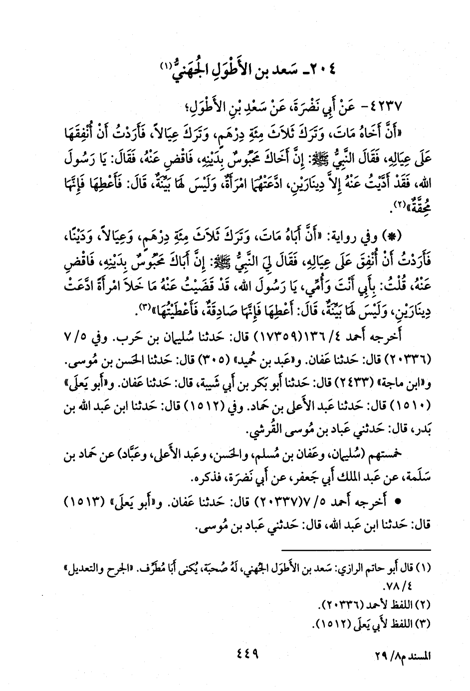 (¬١) قال أَبو حاتم الرازي: سعد بن الأطول الجهني، له صحبة، يكنى أبا مطرف. «الجرح والتعديل» ٤/ ٧٨.
