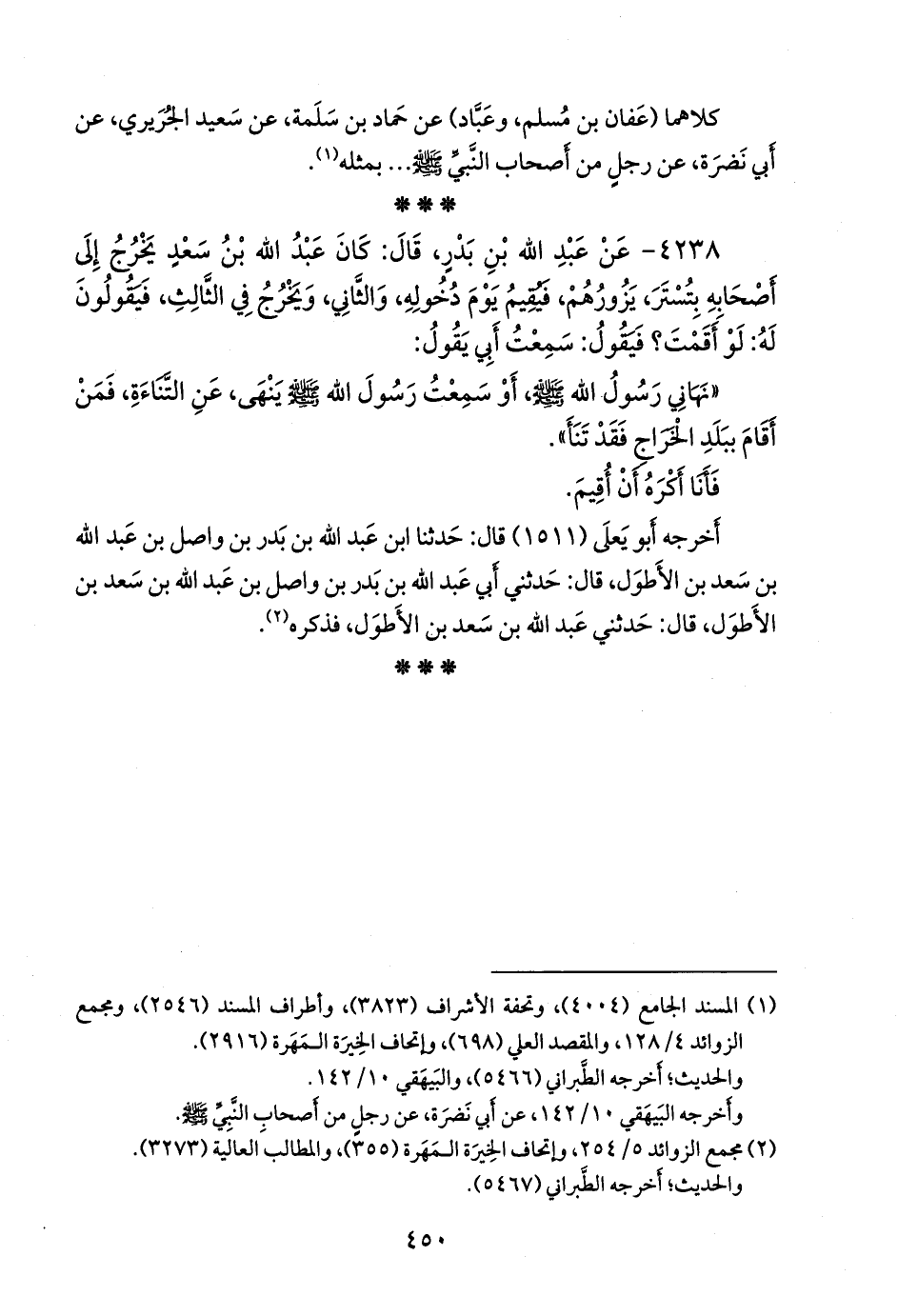 ٤٢٣٨ - عن عبد الله بن بدر، قال: كان عبد الله بن سعد يخرج إلى أصحابه بتستر، يزورهم، فيقيم يوم دخوله، والثاني، ويخرج في الثالث، فيقولون له: لو أقمت؟ فيقول: سمعت أبي يقول:
