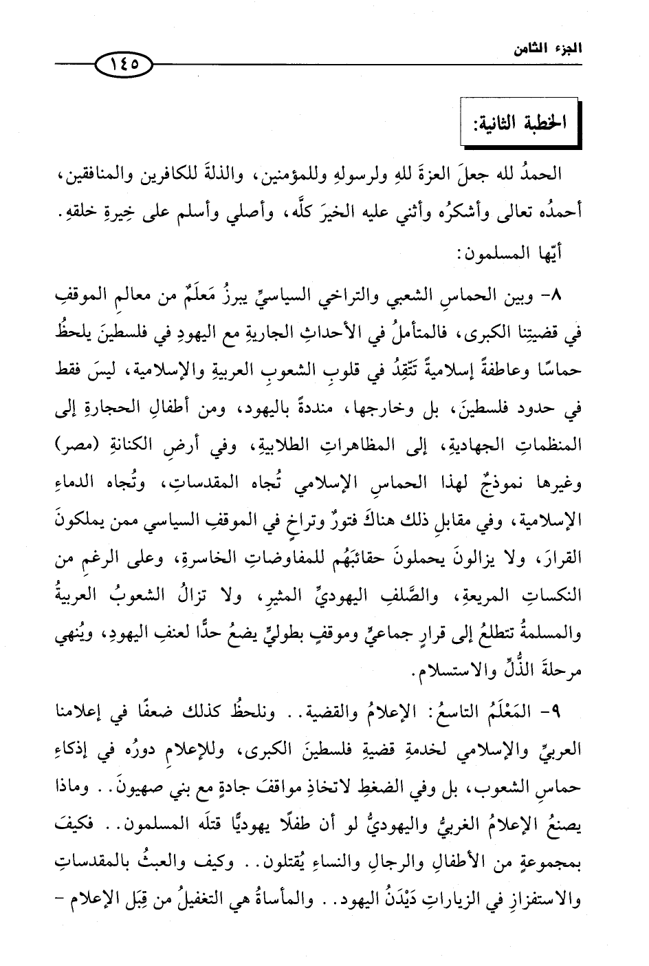 8 - وبين الحماسِ الشعبي والتراخي السياسيِّ يبرزُ مَعلَمٌ من معالمِ الموقفِ في قضيتِنا الكبرى، فالمتأملُ في الأحداثِ الجاريةِ مع اليهودِ في فلسطينَ يلحظُ حماسًا وعاطفةً إسلاميةً تَتّقِدُ في قلوبِ الشعوبِ العربيةِ والإسلامية، ليسَ فقط في حدود فلسطينَ، بل وخارجها، منددةً باليهود، ومن أطفالِ الحجارةِ إلى المنظماتِ الجهاديةِ، إلى المظاهراتِ الطلابيةِ، وفي أرضِ الكنانةِ (مصر) وغيرها نموذجٌ لهذا الحماسِ الإسلامي تُجاه المقدساتِ، وتُجاه الدماءِ الإسلامية، وفي مقابلِ ذلك هناكَ فتورٌ وتراخٍ في الموقفِ السياسي ممن يملكونَ القرارَ، ولا يزالونَ يحملونَ حقائبَهُم للمفاوضاتِ الخاسرةِ، وعلى الرغمِ من النكساتِ المريعةِ، والصَّلفِ اليهوديِّ المثيرِ، ولا تزالُ الشعوبُ العربيةُ والمسلمةُ تتطلعُ إلى قرارٍ جماعيٍّ وموقفٍ بطوليٍّ يضعُ حدًّا لعنفِ اليهودِ، ويُنهي مرحلةَ الذُّلِّ والاستسلام.