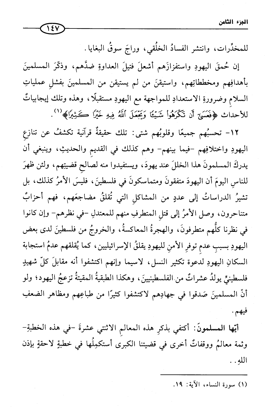 أيّها المسلمونَ: أكتفي بذكرِ هذه المعالمِ الاثنتي عشرةَ - في هذه الخطبةِ - وثمة معالمُ ووقفاتٌ أخرى في قضيتنا الكبرى أستكمِلُها في خطبةٍ لاحقةٍ بإذن اللهِ ..
