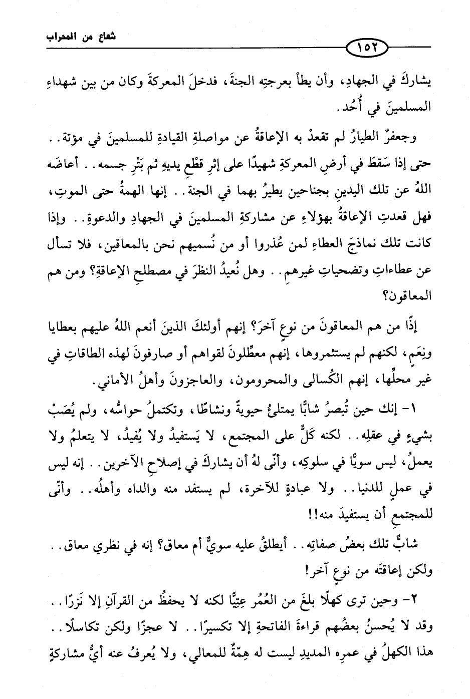 وجعفرٌ الطيارُ لم تقعدْ به الإعاقةُ عن مواصلةِ القيادةِ للمسلمينَ في مؤتة .. حتى إذا سَقطَ في أرضِ المعركةِ شهيدًا على إثرِ قطْعِ يديهِ ثم بَتْرِ جسمه .. أعاضَه اللهُ عن تلك اليدينِ بجناحين يطيرُ بهما في الجنة .. إنها الهمةُ حتى الموتِ، فهل قعدتِ الإعاقةُ بهؤلاءِ عن مشاركةِ المسلمينَ في الجهادِ والدعوةِ .. وإذا كانت تلك نماذجَ العطاءِ لمن عُذروا أو من نُسميهم نحن بالمعاقين، فلا تسأل عن عطاءاتِ وتضحياتِ غيرهمِ .. وهل نُعيدُ النظرَ في مصطلحِ الإعاقةِ؟ ومن هم المعاقون؟