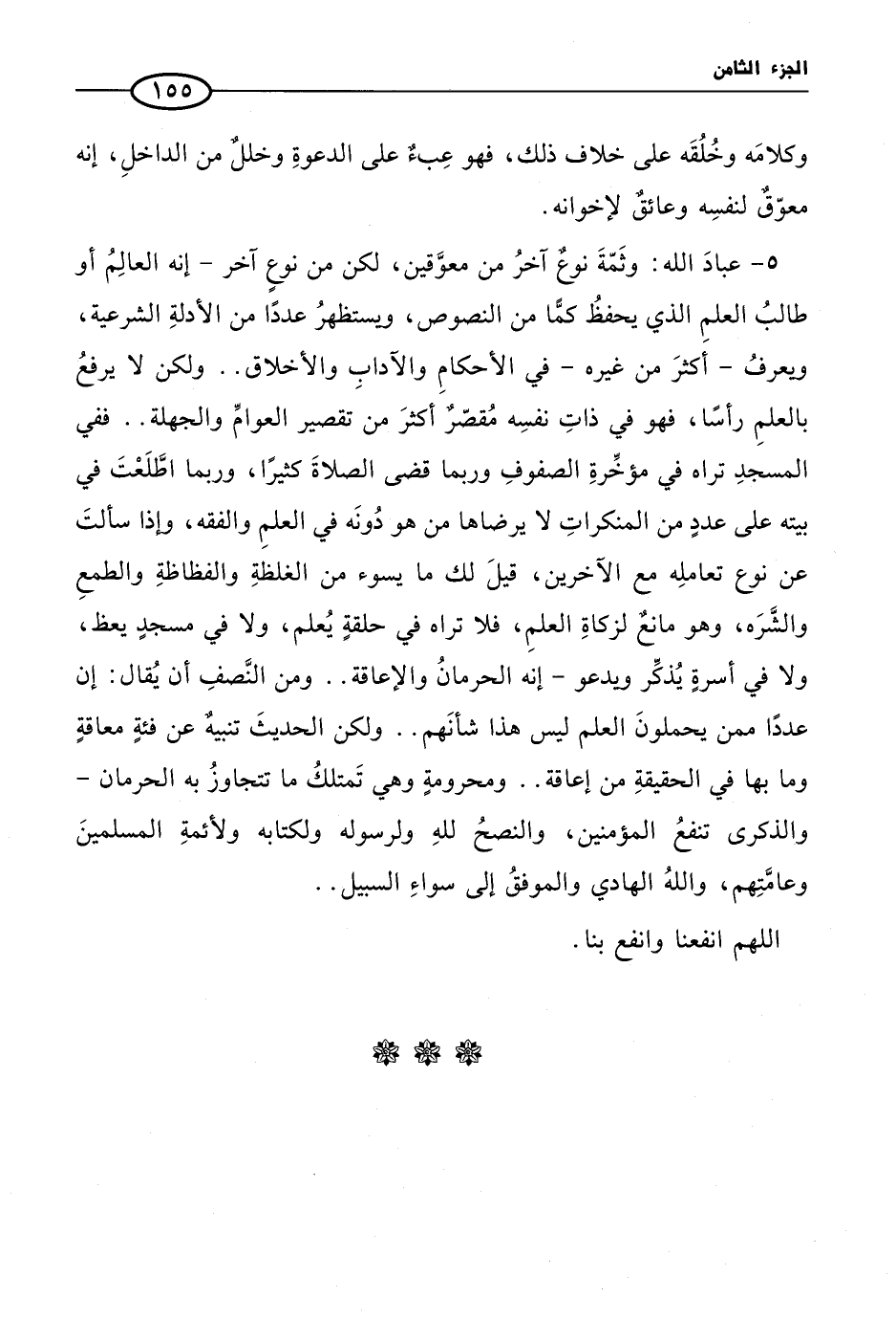 5 - عبادَ الله: وثَمّةَ نوعٌ آخرُ من معوَّقين، لكن من نوعٍ آخر - إنه العالِمُ أو طالبُ العلمِ الذي يحفظُ كمًّا من النصوص، ويستظهرُ عددًا من الأدلةِ الشرعية، ويعرفُ - أكثرَ من غيره - في الأحكامِ والآدابِ والأخلاق .. ولكن لا يرفعُ بالعلمِ رأسًا، فهو في ذاتِ نفسِه مُقصّرٌ أكثرَ من تقصير العوامِّ والجهلة .. ففي المسجدِ تراه في مؤخِّرةِ الصفوفِ وربما قضى الصلاةَ كثيرًا، وربما اطَّلَعْتَ في بيته على عددٍ من المنكراتِ لا يرضاها من هو دُونَه في العلمِ والفقه، وإذا سألتَ عن نوع تعاملِه مع الآخرين، قيلَ لك ما يسوء من الغلظةِ والفظاظةِ والطمعِ والشَّرَه، وهو مانعٌ لزكاةِ العلمِ، فلا تراه في حلقةٍ يُعلم، ولا في مسجدٍ يعظ، ولا في أسرةٍ يُذكِّر ويدعو - إنه الحرمانُ والإعاقة .. ومن النَّصفِ أن يُقال: إن عددًا ممن يحملونَ العلم ليس هذا شأنَهم .. ولكن الحديثَ تنبيهٌ عن فئةٍ معاقةٍ وما بها في الحقيقةِ من إعاقة .. ومحرومةٍ وهي تَمتلكُ ما تتجاوزُ به الحرمان - والذكرى تنفعُ المؤمنين، والنصحُ للهِ ولرسوله ولكتابه ولأئمةِ المسلمينَ وعامَّتِهم، واللهُ الهادي والموفقُ إلى سواءِ السبيل ..