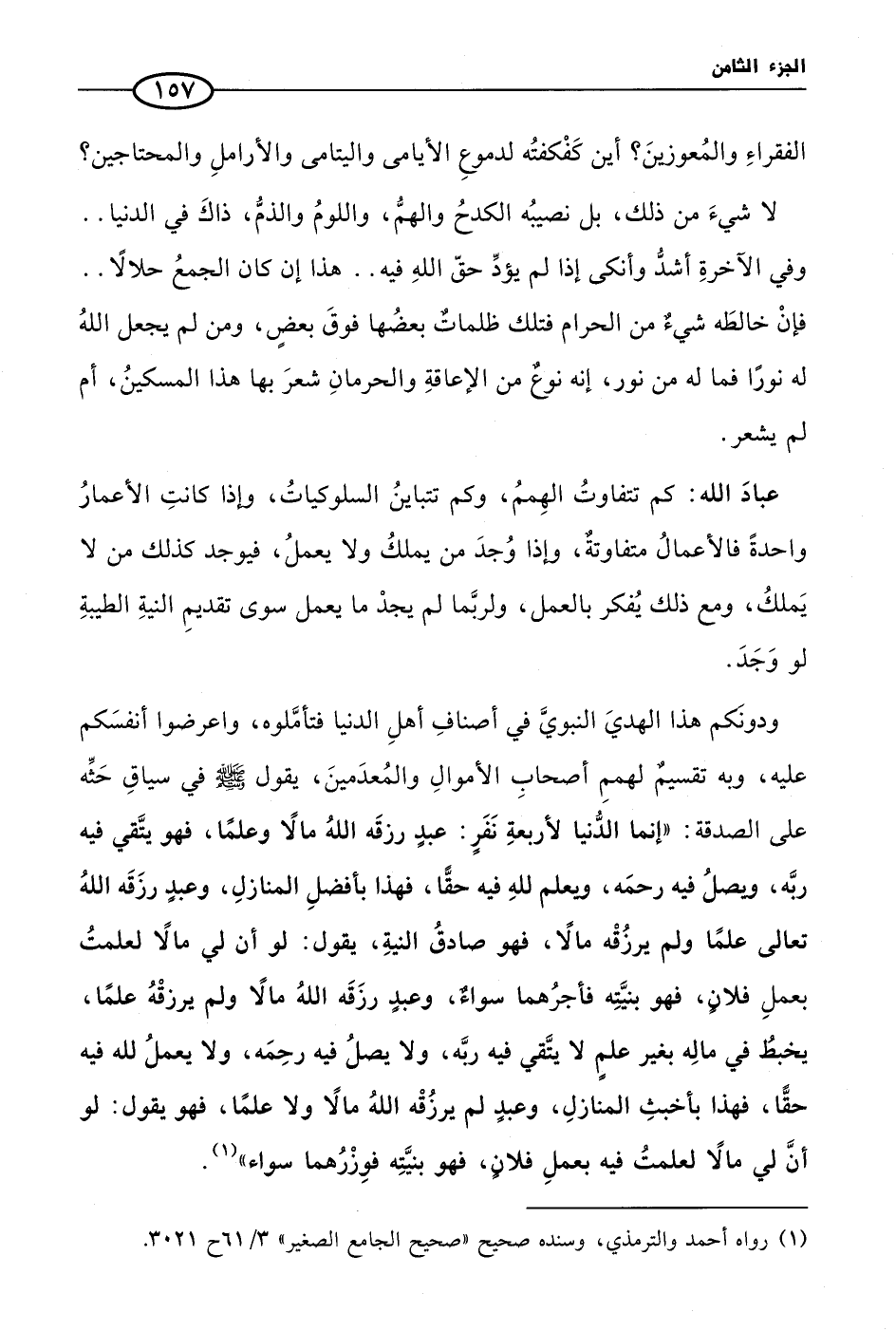 ودونَكم هذا الهديَ النبويَّ في أصنافِ أهلِ الدنيا فتأمَّلوه، واعرضوا أنفسَكم عليه، وبه تقسيمٌ لهممِ أصحابِ الأموالِ والمُعدَمينَ، يقول صلى الله عليه وسلم في سياقِ حَثِّه على الصدقة: «إنما الدُّنيا لأربعةِ نَفَرٍ: عبدٍ رزقَه اللهُ مالًا وعلمًا، فهو يتَّقي فيه ربَّه، ويصلُ فيه رحمَه، ويعلم للهِ فيه حقًّا، فهذا بأفضلِ المنازلِ، وعبدٍ رزَقَه اللهُ تعالى علمًا ولم يرزُقْه مالًا، فهو صادقُ النيةِ، يقول: لو أن لي مالًا لعلمتُ بعملِ فلانٍ، فهو بنيَّتِه فأجرُهما سواءٌ، وعبدٍ رزَقَه اللهُ مالًا ولم يرزقْهُ علمًا، يخبطُ في مالِه بغير علمٍ لا يتَّقي فيه ربَّه، ولا يصلُ فيه رحِمَه، ولا يعملُ لله فيه حقًّا، فهذا بأخبثِ المنازلِ، وعبدٍ لم يرزُقْه اللهُ مالًا ولا علمًا، فهو يقول: لو أنَّ لي مالًا لعلمتُ فيه بعملِ فلانٍ، فهو بنيَّتِه فوِزْرُهما سواء» (¬1).