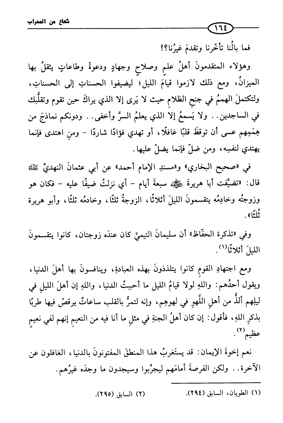 في «صحيح البخاري» و «مسندِ الإمام أحمد» عن أبي عثمانَ النهديِّ رحمَه الله قال: «تضيَّفت أبا هريرةَ رضيَ الله عنه سبعةَ أيام - أي نزلتُ ضيفًا عليه - فكان هو وزوجتُه وخادِمُه يتقسمونَ الليلَ أثلاثًا، الزوجةُ ثلثًا، وخادمُه ثلثًا، وأبو هريرة ثُلثًا».