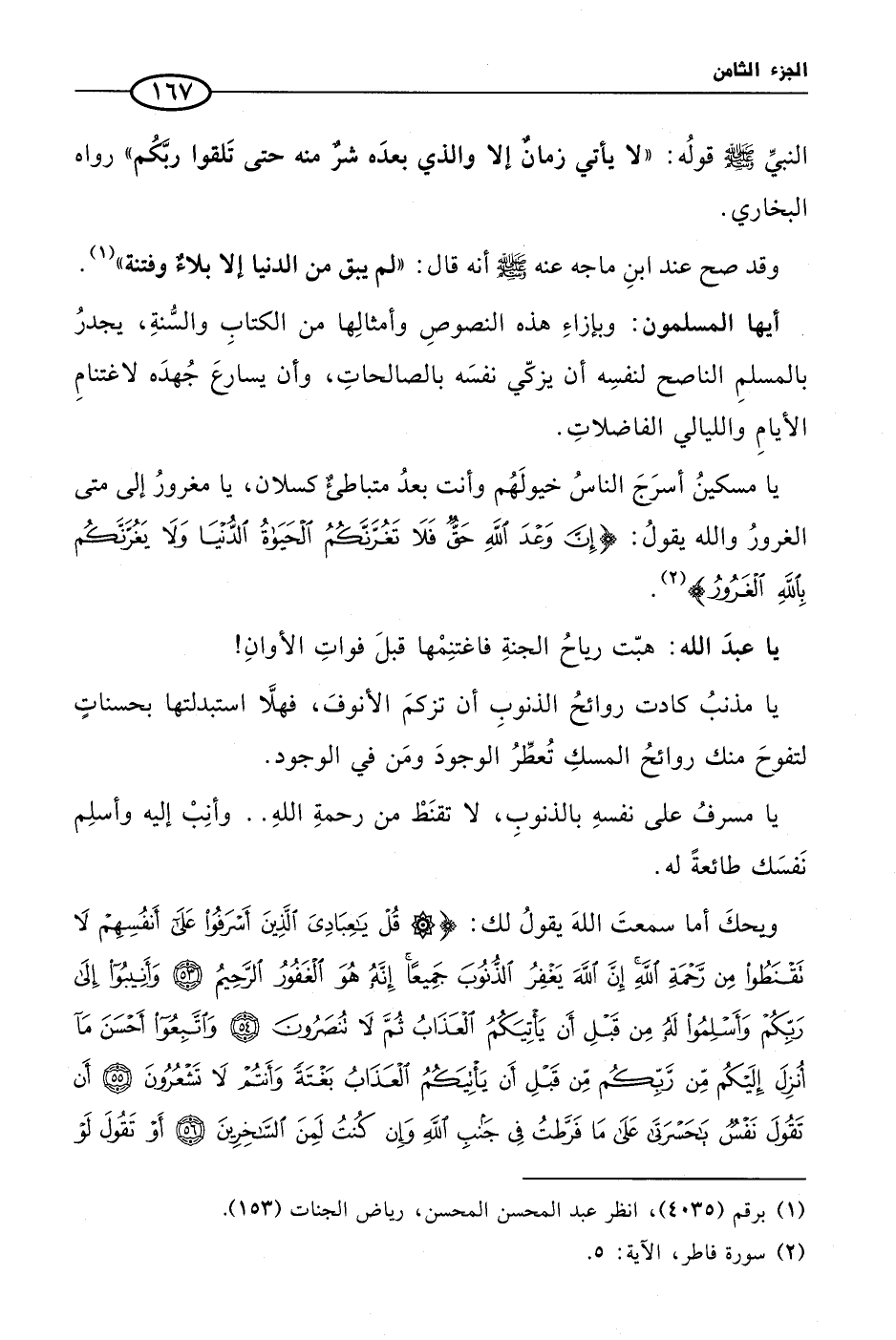 يا مسكينُ أسرَجَ الناسُ خيولَهُم وأنت بعدُ متباطئٌ كسلان، يا مغرورُ إلى متى الغرورُ والله يقولُ: {إِنَّ وَعْدَ اللَّهِ حَقٌّ فَلَا تَغُرَّنَّكُمُ الْحَيَاةُ الدُّنْيَا وَلَا يَغُرَّنَّكُمْ بِاللَّهِ الْغَرُورُ} (¬2).