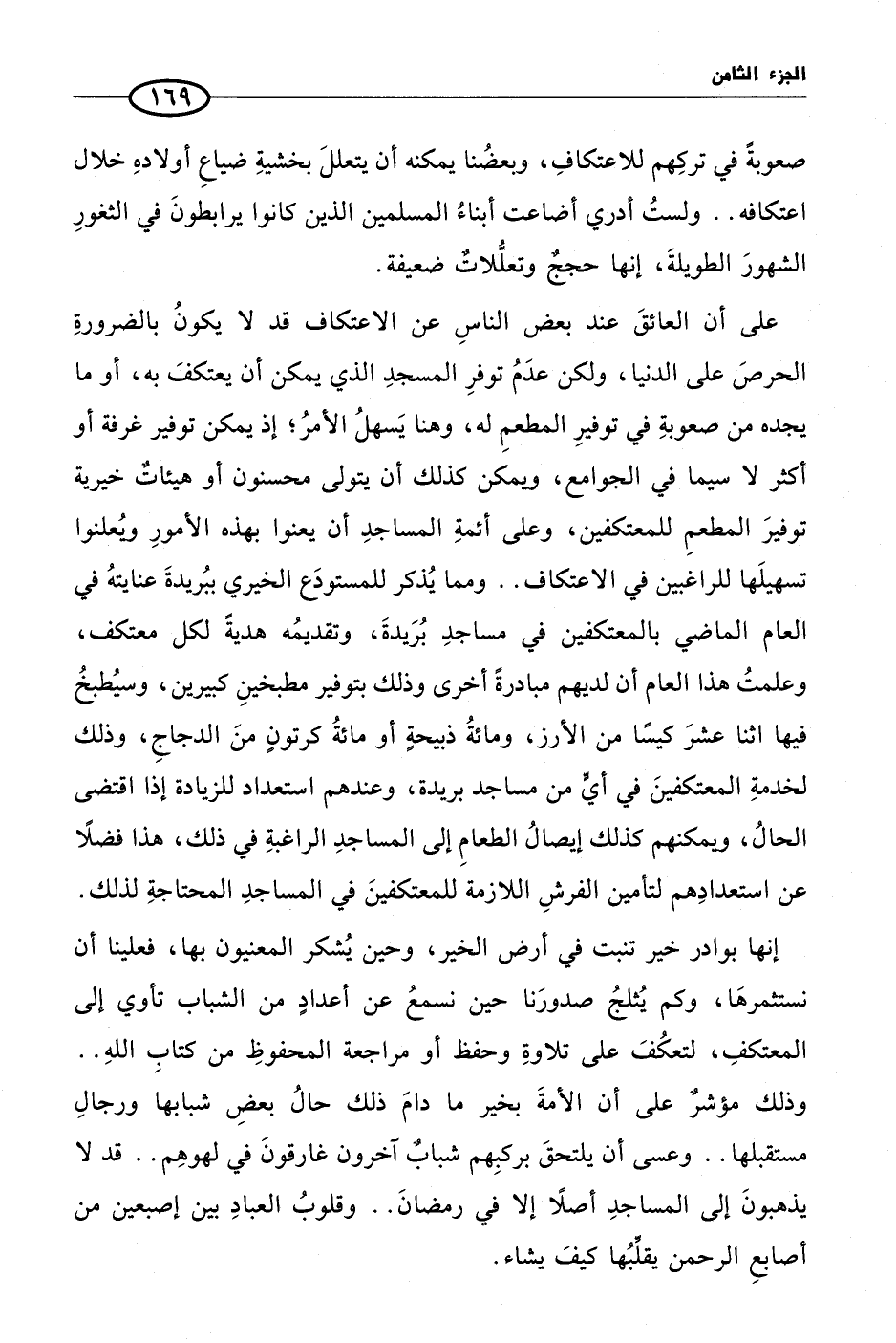 على أن العائقَ عند بعض الناسِ عن الاعتكاف قد لا يكونُ بالضرورةِ الحرصَ على الدنيا، ولكن عدَمُ توفرِ المسجدِ الذي يمكن أن يعتكفَ به، أو ما يجده من صعوبةِ في توفيرِ المطعمِ له، وهنا يَسهلُ الأمرُ؛ إذ يمكن توفير غرفة أو أكثر لا سيما في الجوامع، ويمكن كذلك أن يتولى محسنون أو هيئاتٌ خيرية توفيرَ المطعمِ للمعتكفين، وعلى أئمةِ المساجدِ أن يعنوا بهذه الأمورِ ويُعلنوا تسهيلَها للراغبين في الاعتكاف .. ومما يُذكر للمستودَع الخيري ببُريدةَ عنايتهُ في العام الماضي بالمعتكفين في مساجدِ بُرَيدةَ، وتقديمُه هديةً لكل معتكف، وعلمتُ هذا العام أن لديهم مبادرةً أخرى وذلك بتوفير مطبخينِ كبيرين، وسيُطبخُ فيها اثنا عشرَ كيسًا من الأرز، ومائةُ ذبيحةٍ أو مائةُ كرتونٍ منَ الدجاجِ، وذلك لخدمةِ المعتكفينَ في أيٍّ من مساجد بريدة، وعندهم استعداد للزيادة إذا اقتضى الحالُ، ويمكنهم كذلك إيصالُ الطعامِ إلى المساجدِ الراغبةِ في ذلك، هذا فضلًا عن استعدادِهم لتأمين الفرشِ اللازمة للمعتكفينَ في المساجدِ المحتاجةِ لذلك.