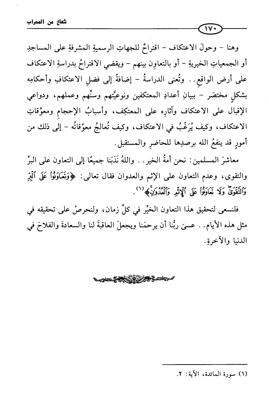 فلنسعى لتحقيق هذا التعاون الخيِّر في كلِّ زمان، ولنحرصْ على تحقيقه في مثل هذه الأيام .. عسىَ ربُّنا أن يرحمَنا ويجعلَ العاقبةَ لنا والسعادةَ والفلاحَ في الدنيا والآخرةِ.