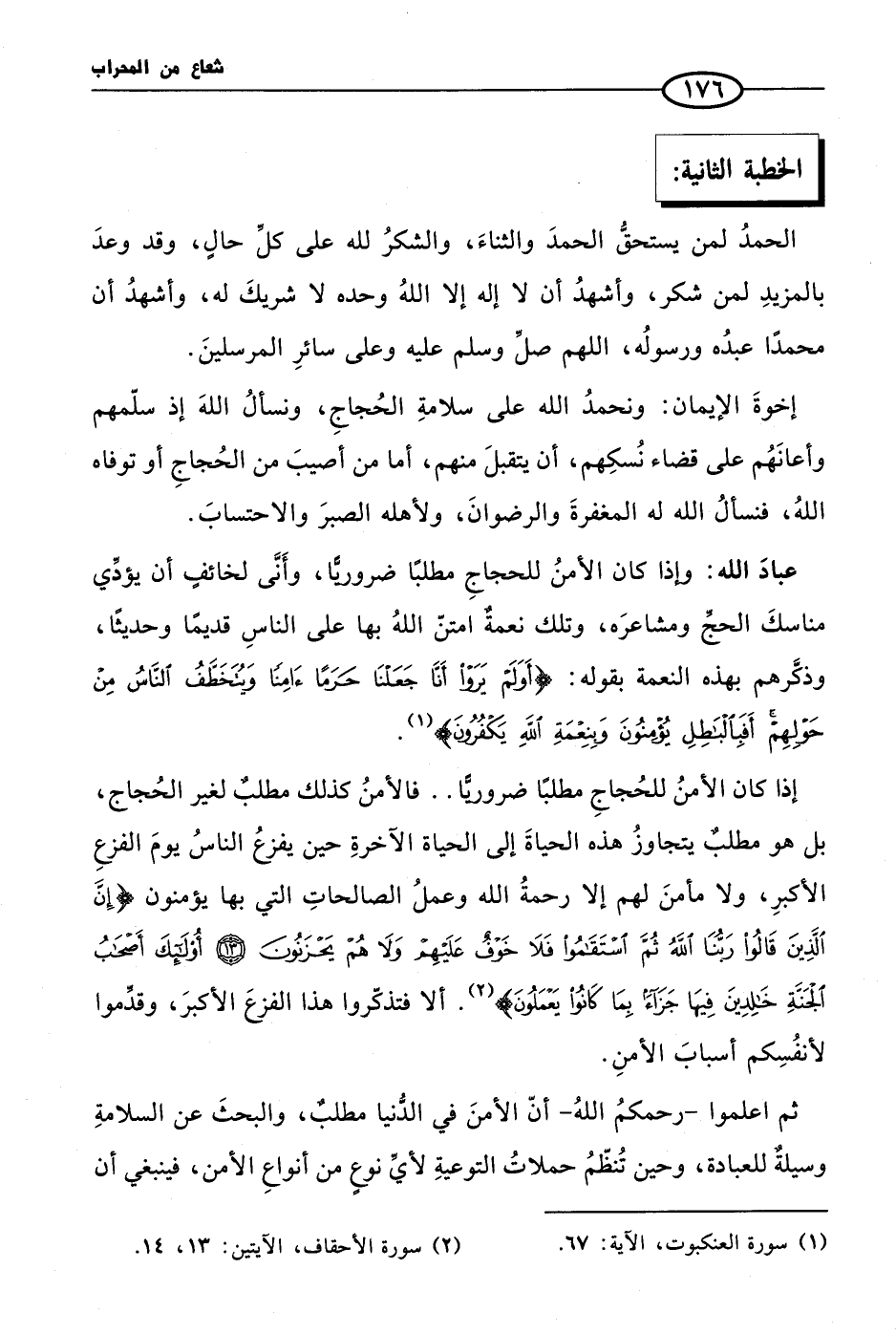 إذا كان الأمنُ للحُجاجِ مطلبًا ضروريًّا .. فالأمنُ كذلك مطلبٌ لغير الحُجاج، بل هو مطلبٌ يتجاوزُ هذه الحياةَ إلى الحياة الآخرةِ حين يفزعُ الناسُ يومَ الفزعِ الأكبرِ، ولا مأمنَ لهم إلا رحمةُ الله وعملُ الصالحاتِ التي بها يؤمنون {إِنَّ الَّذِينَ قَالُوا رَبُّنَا اللهُ ثُمَّ اسْتَقَامُوا فَلَا خَوْفٌ عَلَيْهِمْ وَلَا هُمْ يَحْزَنُونَ (13) أُولَئِكَ أَصْحَابُ الْجَنَّةِ خَالِدِينَ فِيهَا جَزَاءً بِمَا كَانُوا يَعْمَلُونَ} (¬2). ألا فتذكّروا هذا الفزعَ الأكبرَ، وقدِّموا لأنفُسِكم أسبابَ الأمنِ.