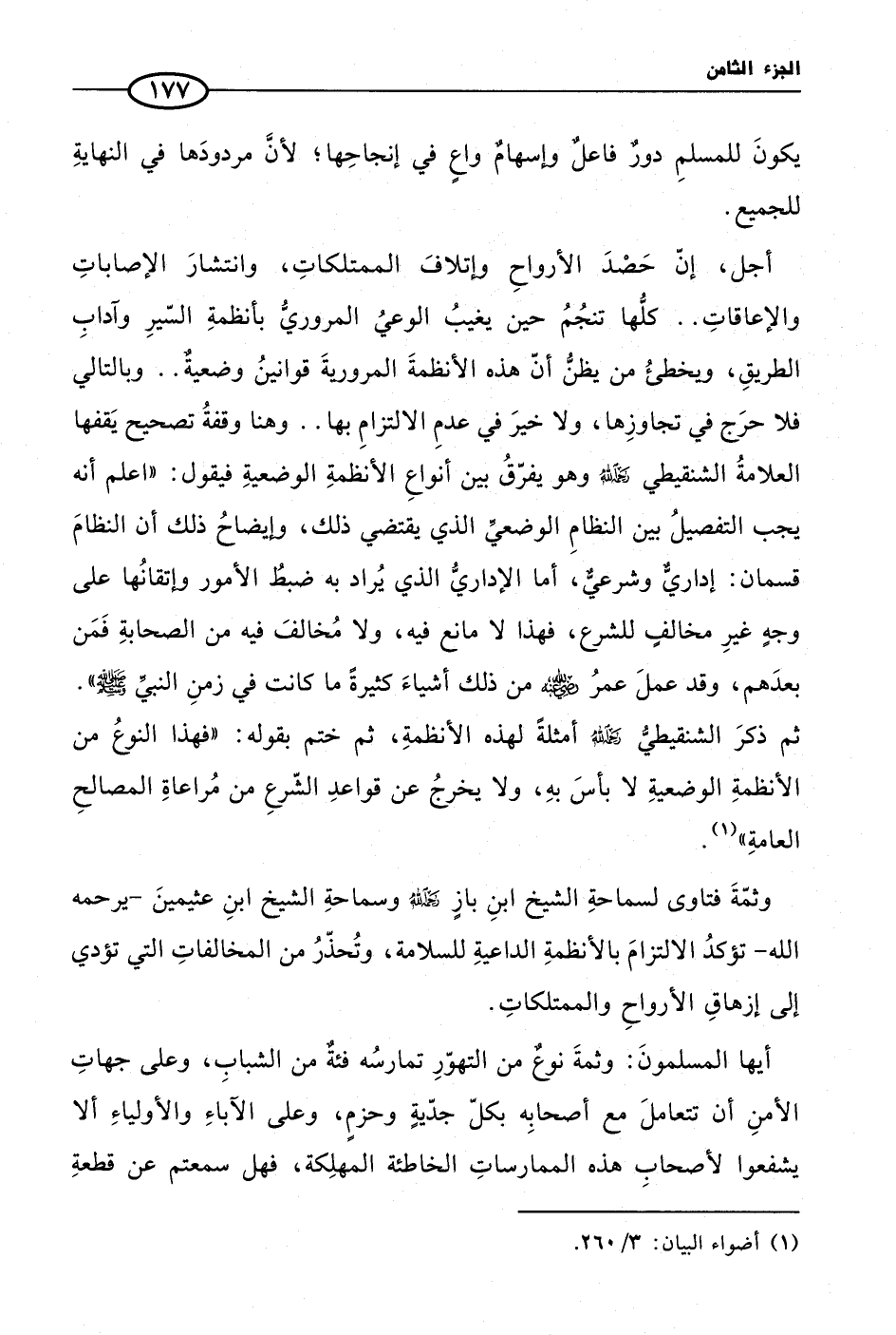 أجل، إنّ حَصْدَ الأرواحِ وإتلافَ الممتلكاتِ، وانتشارَ الإصاباتِ والإعاقاتِ .. كلُّها تنجُمُ حين يغيبُ الوعيُ المروريُّ بأنظمةِ السّيرِ وآدابِ الطريقِ، ويخطئُ من يظنُّ أنّ هذه الأنظمةَ المروريةَ قوانينُ وضعيةٌ .. وبالتالي فلا حرَج في تجاوزِها، ولا خيرَ في عدمِ الالتزامِ بها .. وهنا وقفةُ تصحيح يَقفها العلامةُ الشنقيطي - رحمَه اللهُ - وهو يفرّقُ بين أنواعِ الأنظمةِ الوضعيةِ فيقول: «اعلم أنه يجب التفصيلُ بين النظامِ الوضعيِّ الذي يقتضي ذلك، وإيضاحُ ذلك أن النظامَ قسمان: إداريٌّ وشرعيٌّ، أما الإداريُّ الذي يُراد به ضبطُ الأمور وإتقانُها على وجهٍ غيرِ مخالفٍ للشرع، فهذا لا مانع فيه، ولا مُخالفَ فيه من الصحابةِ فَمَن بعدَهم، وقد عملَ عمرُ - رضي اللهُ عنه - من ذلك أشياءَ كثيرةً ما كانت في زمنِ النبيِّ صلى الله عليه وسلم». ثم ذكرَ الشنقيطيُّ - رحمه الله - أمثلةً لهذه الأنظمةِ، ثم ختم بقوله: «فهذا النوعُ من الأنظمةِ الوضعيةِ لا بأسَ بهِ، ولا يخرجُ عن قواعدِ الشّرعِ من مُراعاةِ المصالحِ العامةِ» (¬1).