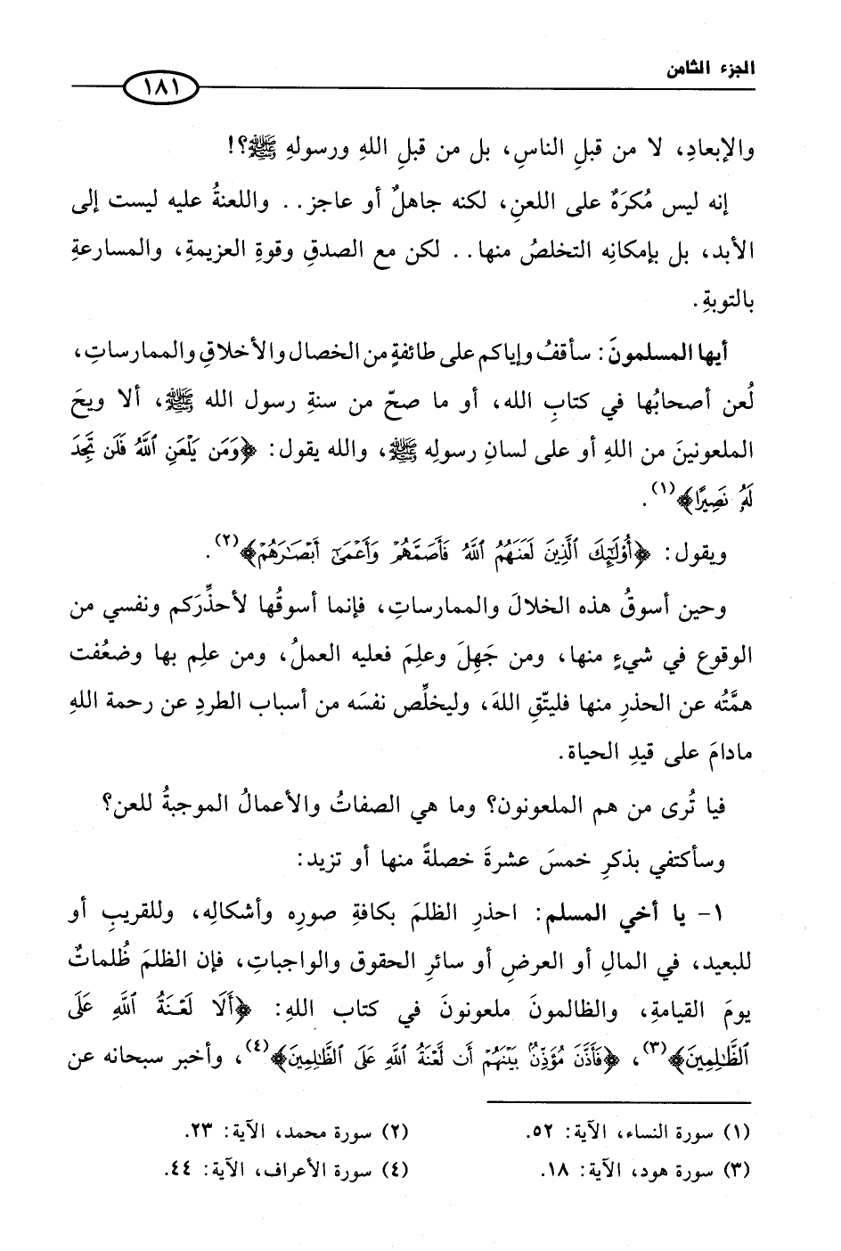 أيها المسلمونَ: سأقفُ وإياكم على طائفةٍ من الخصال والأخلاقِ والممارساتِ، لُعن أصحابُها في كتابِ الله، أو ما صحّ من سنةِ رسول الله صلى الله عليه وسلم، ألا ويحَ الملعونينَ من اللهِ أو على لسانِ رسولِه صلى الله عليه وسلم، والله يقول: {وَمَنْ يَلْعَنِ اللَّهُ فَلَنْ تَجِدَ لَهُ نَصِيرًا} (¬1).
