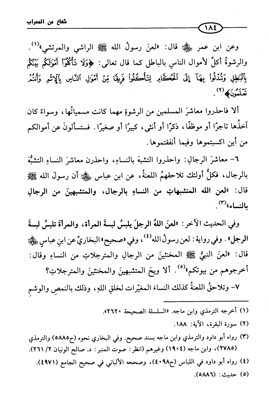 وعن ابن عمر رضي الله عنهما قال: «لعنَ رسولُ الله صلى الله عليه وسلم الراشي والمرتشي» (¬1). والرشوةُ أكلٌ لأموال الناسِ بالباطل كما قال تعالى: {وَلَا تَأْكُلُوا أَمْوَالَكُمْ بَيْنَكُمْ بِالْبَاطِلِ وَتُدْلُوا بِهَا إِلَى الْحُكَّامِ لِتَأْكُلُوا فَرِيقًا مِنْ أَمْوَالِ النَّاسِ بِالْإِثْمِ وَأَنْتُمْ تَعْلَمُونَ} (¬2).