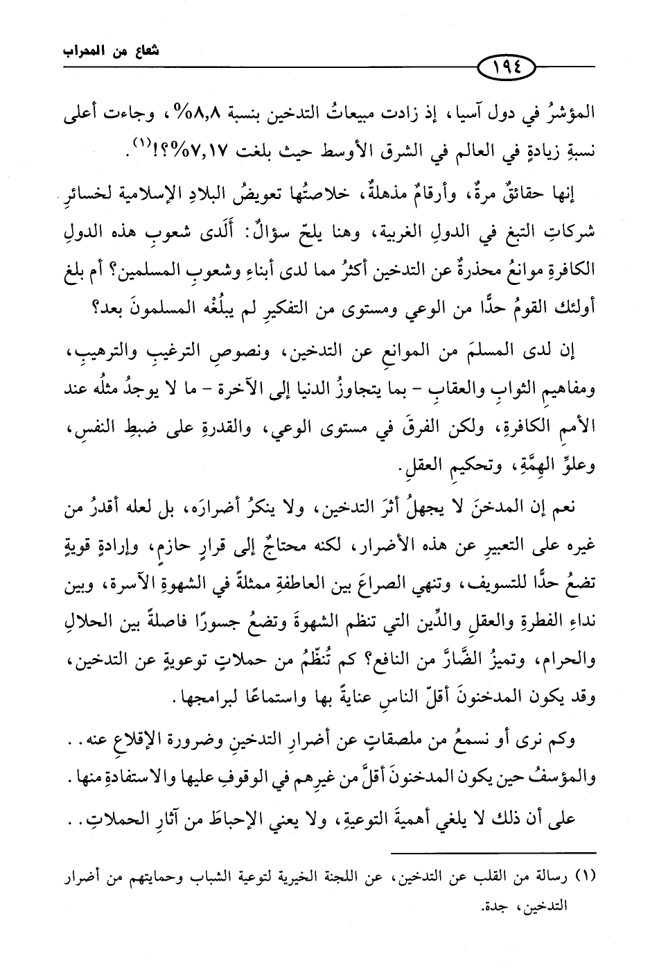 إن لدى المسلمَ من الموانعِ عن التدخين، ونصوصِ الترغيبِ والترهيبِ، ومفاهيمِ الثوابِ والعقابِ - بما يتجاوزُ الدنيا إلى الآخرة - ما لا يوجدُ مثلُه عند الأممِ الكافرةِ، ولكن الفرقَ في مستوى الوعي، والقدرةِ على ضبطِ النفسِ، وعلوِّ الهِمَّةِ، وتحكيمِ العقلِ.