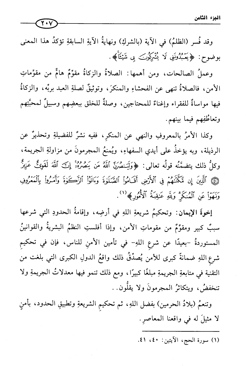 وكذا الأمرُ بالمعروفِ والنهي عن المنكرِ، ففيه نشرٌ للفضيلةِ وتحذيرٌ عن الرذيلة، وبه يؤخذُ على أيدي السفهاءِ، ويُمنعُ المجرمونَ من مزاولةِ الجريمة، وكلُّ ذلك يتضمَّنُه قولُه تعالى: {وَلَيَنْصُرَنَّ اللَّهُ مَنْ يَنْصُرُهُ إِنَّ اللَّهَ لَقَوِيٌّ عَزِيزٌ (40) الَّذِينَ إِنْ مَكَّنَّاهُمْ فِي الْأَرْضِ أَقَامُوا الصَّلَاةَ وَآتَوُا الزَّكَاةَ وَأَمَرُوا بِالْمَعْرُوفِ وَنَهَوْا عَنِ الْمُنْكَرِ وَلِلَّهِ عَاقِبَةُ الْأُمُورِ} (¬1).