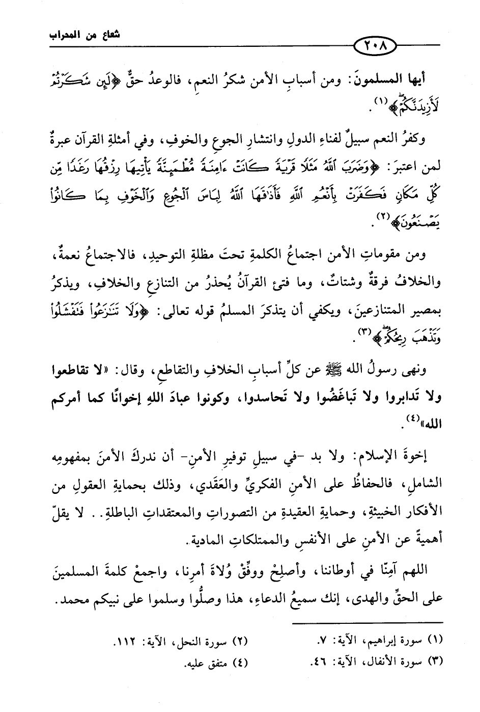 اللهم آمِنّا في أوطاننا، وأصلِحْ ووفِّقْ وُلاةَ أمرِنا، واجمعْ كلمةَ المسلمينَ على الحقِّ والهدى، إنك سميعُ الدعاءِ، هذا وصلُّوا وسلموا على نبيكم محمد.