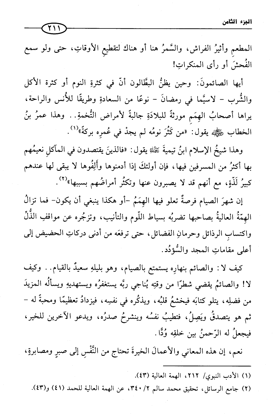 أيها الصائمونَ: وحين يظنُّ البطَّالون أنّ في كثرةِ النوم أو كثرة الأكل والشُّرب - لاسيَّما في رمضانَ - نوعًا من السعادةِ وطريقًا للأُنس والراحة، يراها أصحابُ الهِمَمِ مورثةً للبلادَةِ جالبةً لأمراض التُّخمةِ .. وهذا عمرُ بنُ الخطاب رضي الله عنه يقول: «من كَثُرَ نومُه لم يجدْ في عُمرِه بركةً» (¬1).