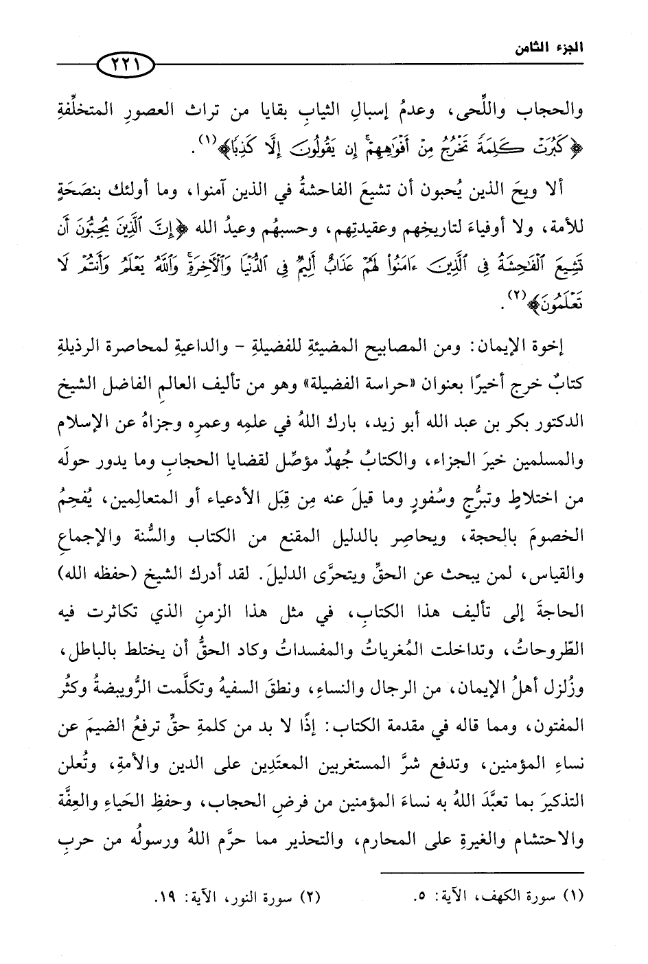 إخوة الإيمان: ومن المصابيح المضيئةِ للفضيلةِ - والداعيةِ لمحاصرة الرذيلةِ كتابٌ خرج أخيرًا بعنوان «حراسة الفضيلة» وهو من تأليف العالمِ الفاضل الشيخ الدكتور بكر بن عبد الله أبو زيد، بارك اللهُ في علمِه وعمرِه وجزاهُ عن الإسلام والمسلمين خيرَ الجزاء، والكتابُ جُهدٌ مؤصِّل لقضايا الحجابِ وما يدور حولَه من اختلاطٍ وتبرُّجٍ وسُفورٍ وما قيلَ عنه مِن قِبَل الأدعياء أو المتعالِمين، يُفحِمُ الخصومَ بالحجة، ويحاصِر بالدليل المقنع من الكتاب والسُّنة والإجماعِ والقياس، لمن يبحث عن الحقِّ ويتحرَّى الدليلَ. لقد أدرك الشيخ (حفظه الله) الحاجةَ إلى تأليف هذا الكتابِ، في مثل هذا الزمنِ الذي تكاثرت فيه الطّروحاتُ، وتداخلت المُغرياتُ والمفسداتُ وكاد الحقُّ أن يختلط بالباطل، وزُلزل أهلُ الإيمان، من الرجال والنساءِ، ونطقَ السفيهُ وتكلَّمت الرُّويبضةُ وكثُر المفتون، ومما قاله في مقدمة الكتاب: إذًا لا بد من كلمةِ حقٍّ ترفعُ الضيمَ عن نساءِ المؤمنين، وتدفع شرَّ المستغربين المعتَدِين على الدين والأمةِ، وتُعلن التذكيرَ بما تعبَّدَ اللهُ به نساءَ المؤمنين من فرضِ الحجاب، وحفظِ الحَياءِ والعِفَّة والاحتشام والغيرةِ على المحارم، والتحذير مما حرَّم اللهُ ورسولُه من حربِ