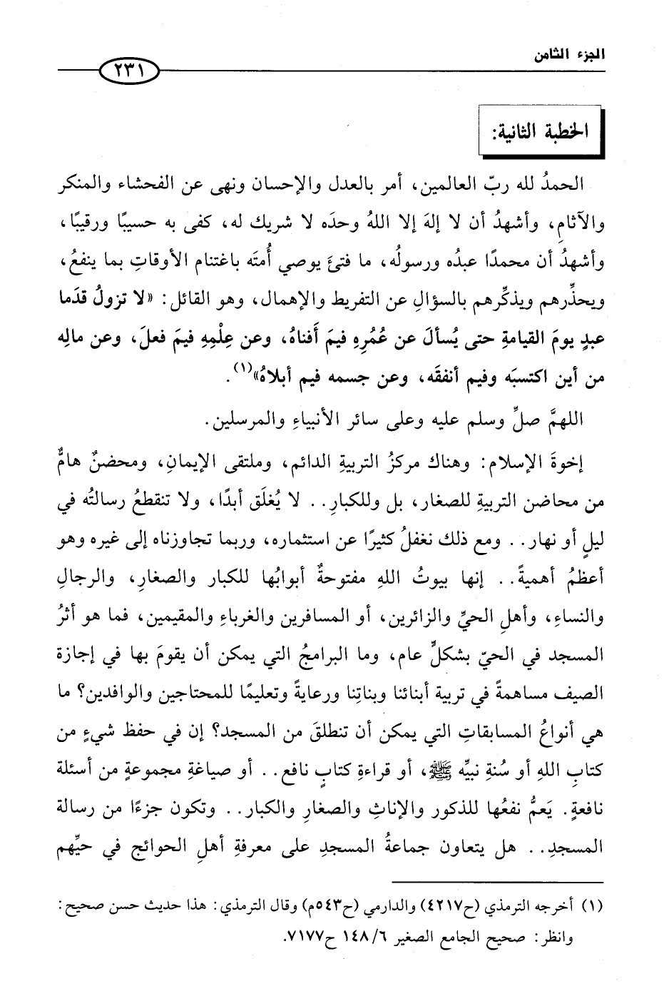 إخوةَ الإسلام: وهناك مركزُ التربيةِ الدائم، وملتقى الإيمانِ، ومحضنٌ هامٌّ من محاضن التربيةِ للصغار، بل وللكبارِ .. لا يُغلَق أبدًا، ولا تنقطعُ رسالتُه في ليلٍ أو نهار .. ومع ذلك نغفلُ كثيرًا عن استثماره، وربما تجاوزناه إلى غيره وهو أعظمُ أهميةً .. إنها بيوتُ اللهِ مفتوحةٌ أبوابُها للكبار والصغارِ، والرجالِ والنساءِ، وأهلِ الحيِّ والزائرين، أو المسافرين والغرباءِ والمقيمين، فما هو أثرُ المسجد في الحيّ بشكلٍّ عام، وما البرامجُ التي يمكن أن يقومَ بها في إجازة الصيف مساهمةً في تربية أبنائنا وبناتِنا ورعايةً وتعليمًا للمحتاجين والوافدين؟ ما هي أنواعُ المسابقاتِ التي يمكن أن تنطلقَ من المسجد؟ إن في حفظ شيءٍ من كتابِ اللهِ أو سُنةِ نبيِّه صلى الله عليه وسلم، أو قراءةِ كتابٍ نافع .. أو صياغةِ مجموعةٍ من أسئلة نافعةٍ. يَعمُّ نفعُها للذكور والإناثِ والصغارِ والكبار .. وتكون جزءًا من رسالة المسجدِ .. هل يتعاون جماعةُ المسجدِ على معرفةِ أهلِ الحوائج في حيِّهم