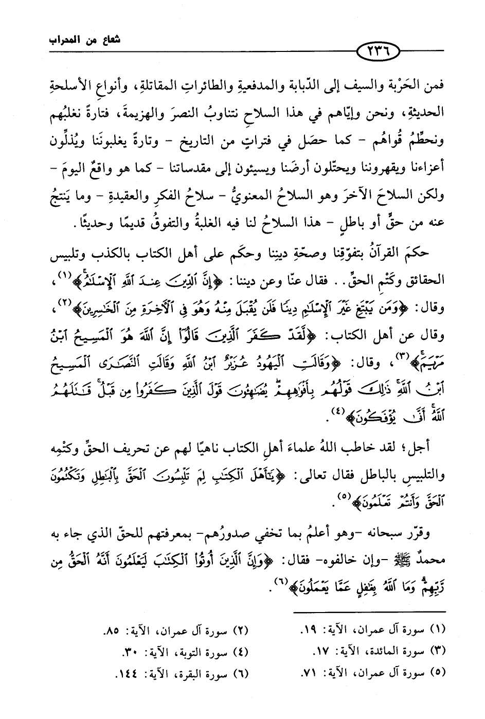 فمن الحَرْبة والسيف إلى الدّبابة والمدفعيةِ والطائراتِ المقاتلةِ، وأنواعِ الأسلحةِ الحديثةِ، ونحن وإيّاهم في هذا السلاحِ نتناوبُ النصرَ والهزيمةَ، فتارةً نغلبُهم ونحطِّمُ قُواهُم - كما حصَل في فتراتٍ من التاريخ - وتارةً يغلبونَنا ويُذلِّون أعزاءنا ويقهروننا ويحتّلون أرضَنا ويسيئون إلى مقدساتنا - كما هو واقعٌ اليومَ - ولكن السلاحَ الآخرَ وهو السلاحُ المعنويُّ - سلاحُ الفكرِ والعقيدةِ - وما يَنتجُ عنه من حقٍّ أو باطلٍ - هذا السلاحُ لنا فيه الغلبةُ والتفوقُ قديمًا وحديثًا.