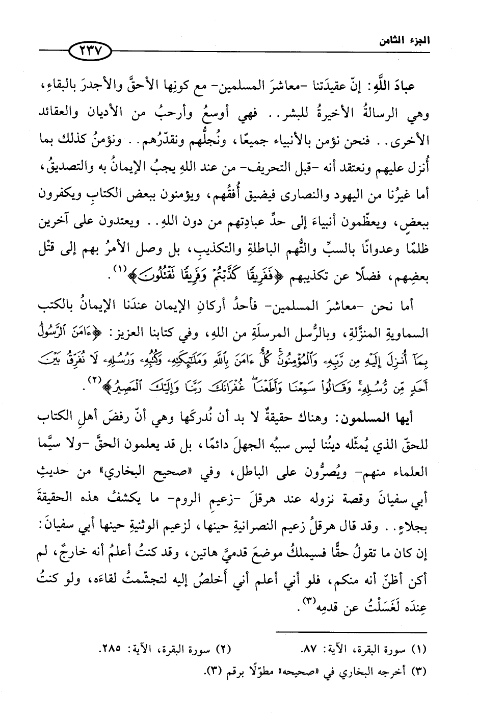 أما نحن - معاشرَ المسلمين - فأحدُ أركانِ الإيمان عندَنا الإيمانُ بالكتب السماويةِ المنزَّلةِ، وبالرُّسل المرسلَةِ من اللهِ، وفي كتابنا العزيز: {آمَنَ الرَّسُولُ بِمَا أُنْزِلَ إِلَيْهِ مِنْ رَبِّهِ وَالْمُؤْمِنُونَ كُلٌّ آمَنَ بِاللَّهِ وَمَلَائِكَتِهِ وَكُتُبِهِ وَرُسُلِهِ لَا نُفَرِّقُ بَيْنَ أَحَدٍ مِنْ رُسُلِهِ وَقَالُوا سَمِعْنَا وَأَطَعْنَا غُفْرَانَكَ رَبَّنَا وَإِلَيْكَ الْمَصِيرُ} (¬2).