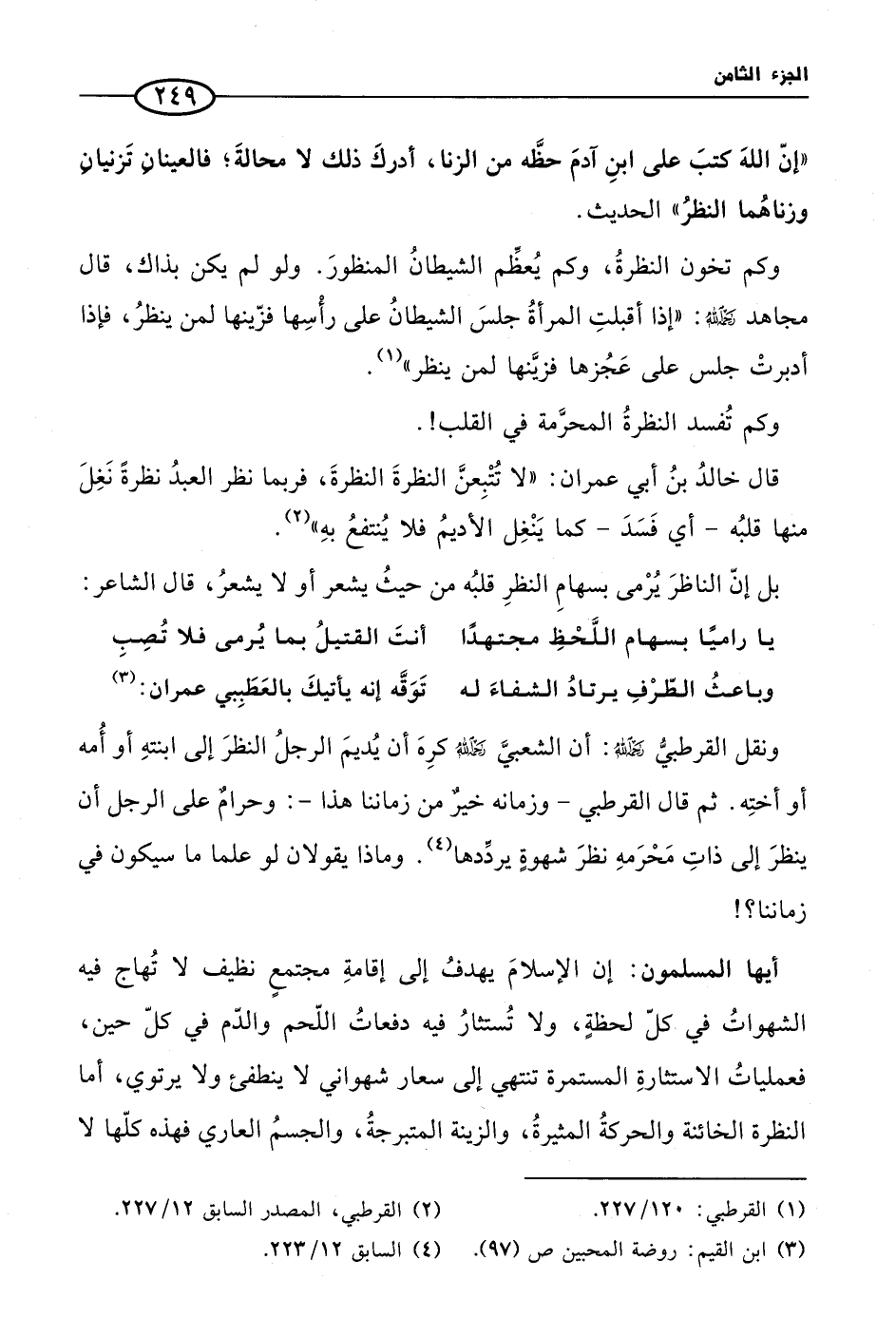 ونقل القرطبيُّ رحمَه اللهُ: أن الشعبيَّ رحمَه اللهُ كرِهَ أن يُديمَ الرجلُ النظرَ إلى ابنتهِ أو أُمه أو أختِه. ثم قال القرطبي - وزمانه خيرٌ من زماننا هذا -: وحرامٌ على الرجل أن ينظرَ إلى ذاتِ مَحْرَمهِ نظرَ شهوةٍ يردِّدها (¬4). وماذا يقولان لو علما ما سيكون في زماننا؟ !