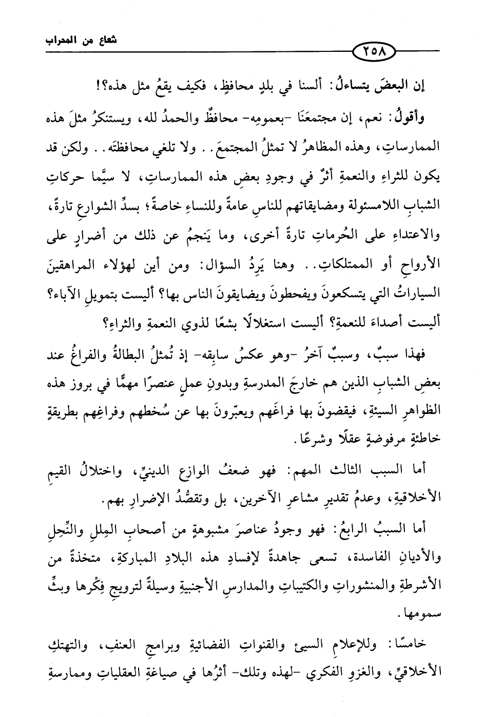 أما السببُ الرابعُ: فهو وجودُ عناصرَ مشبوهةٍ من أصحابِ المِللِ والنِّحِلِ والأديانِ الفاسدة، تسعى جاهدةً لإفسادِ هذه البلادِ المباركةِ، متخذةً من الأشرطةِ والمنشوراتِ والكتيباتِ والمدارسِ الأجنبيةِ وسيلةً لترويجِ فِكْرها وبثِّ سمومها.
