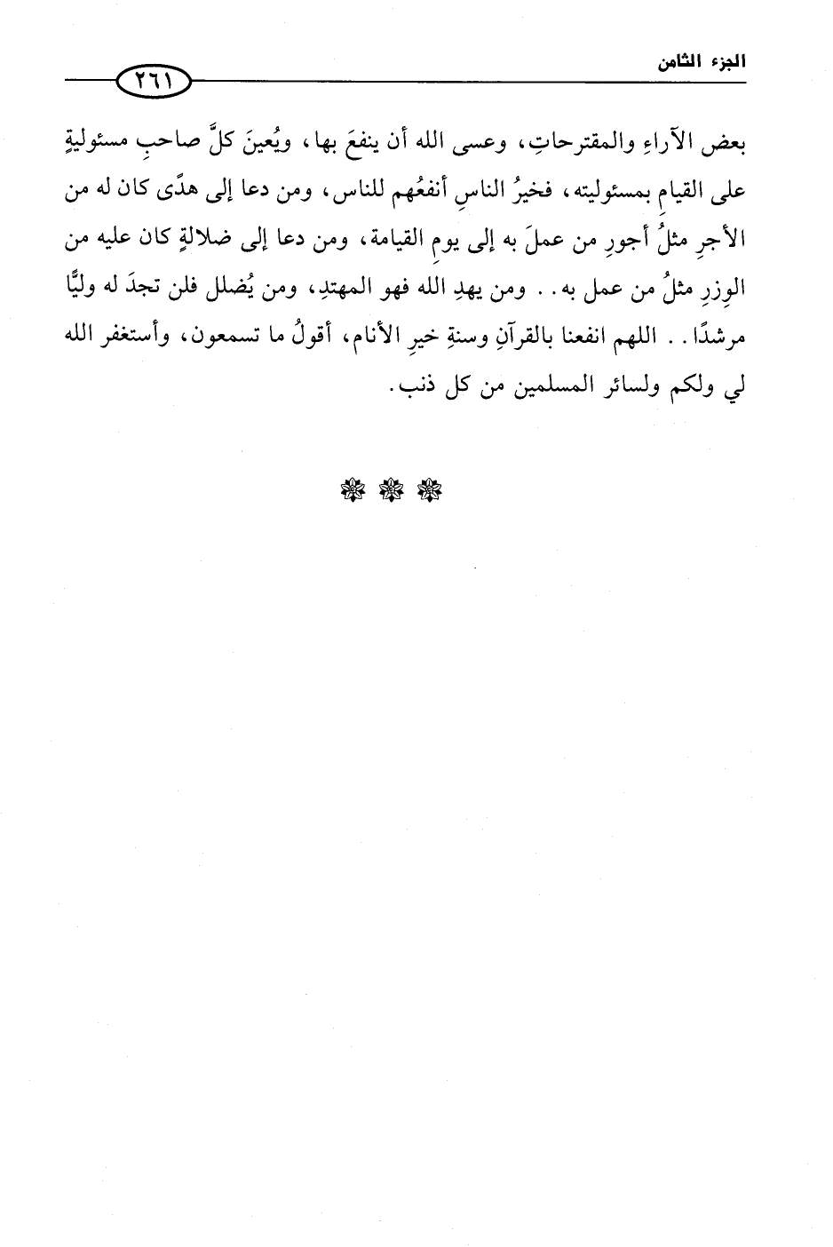 بعض الآراءِ والمقترحاتِ، وعسى الله أن ينفعَ بها، ويُعينَ كلَّ صاحبِ مسئوليةٍ على القيامِ بمسئوليته، فخيرُ الناسِ أنفعُهم للناس، ومن دعا إلى هدًى كان له من الأجرِ مثلُ أجورِ من عملَ به إلى يومِ القيامة، ومن دعا إلى ضلالةٍ كان عليه من الوِزرِ مثلُ من عمل به .. ومن يهدِ الله فهو المهتدِ، ومن يُضلل فلن تجدَ له وليًّا مرشدًا .. اللهم انفعنا بالقرآنِ وسنةِ خيرِ الأنام، أقولُ ما تسمعون، وأستغفر الله لي ولكم ولسائر المسلمين من كل ذنب.