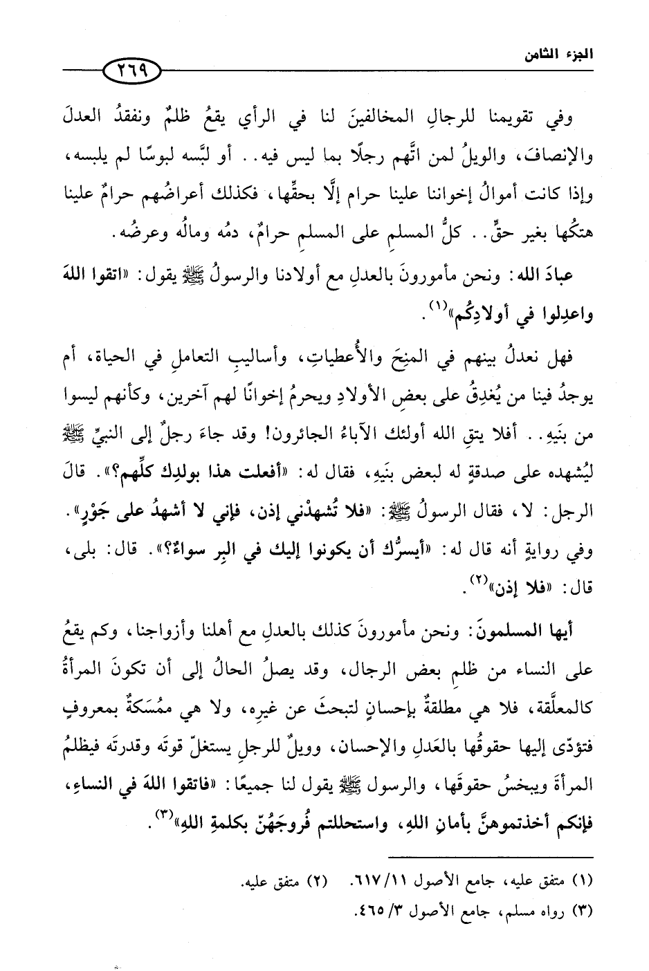 عبادَ الله: ونحن مأمورونَ بالعدلِ مع أولادنا والرسولُ صلى الله عليه وسلم يقول: «اتقوا اللهَ واعدِلوا في أولادِكُم» (¬1).