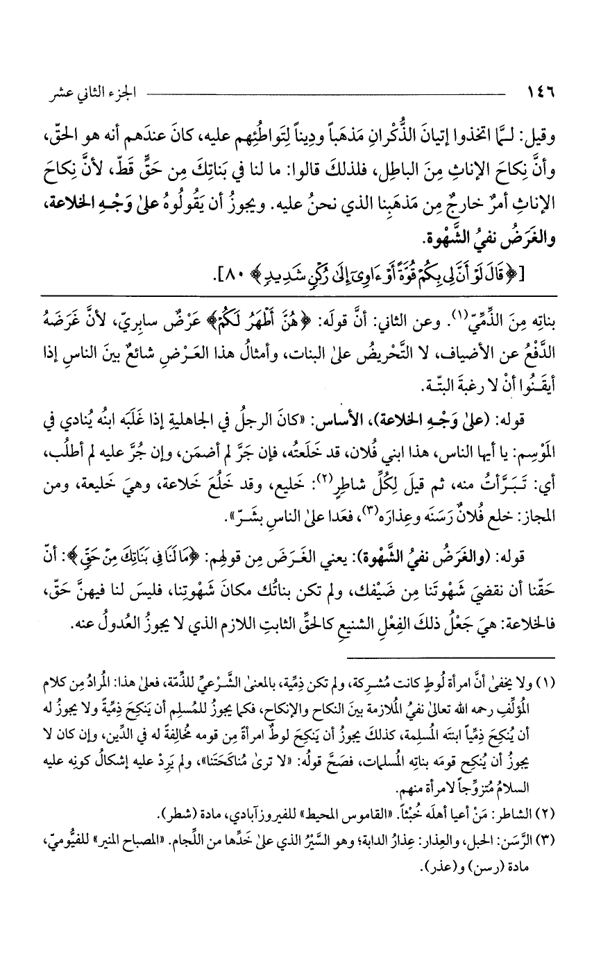 قوله: (والغرض نفي الشهوة): يعني الغرض من قولهم: (مَا لَنَا فِي بَنَاتِكَ مِنْ حَقٍّ): أن حقنا أن نقضي شهوتنا من ضيفك، ولم تكن بناتك مكان شهوتنا، فليس لنا فيهن حق، فالخلاعة: هي جعل ذلك الفعل الشنيع كالحق الثابت اللازم الذي لا يجوز العدول عنه.