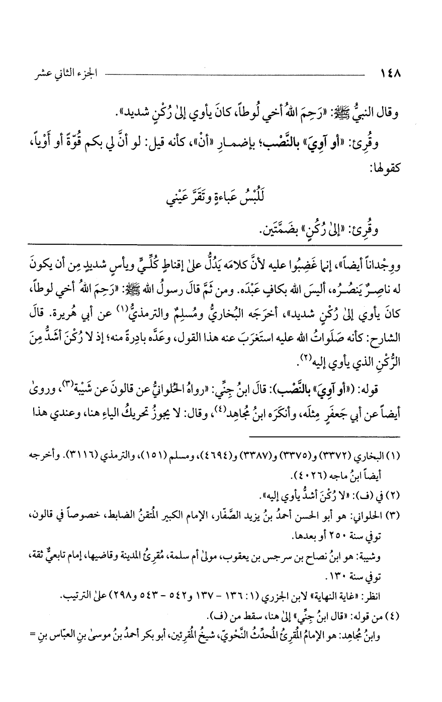 قوله: ("أو آوي" بالنصب): قال ابن جني: "رواه الحلواني عن قالون عن شيبة، وروى أيضاً عن أبي جعفر مثله، وأنكره ابن مجاهد، وقال: لا يجوز تحريك الياء هنا، وعندي هذا