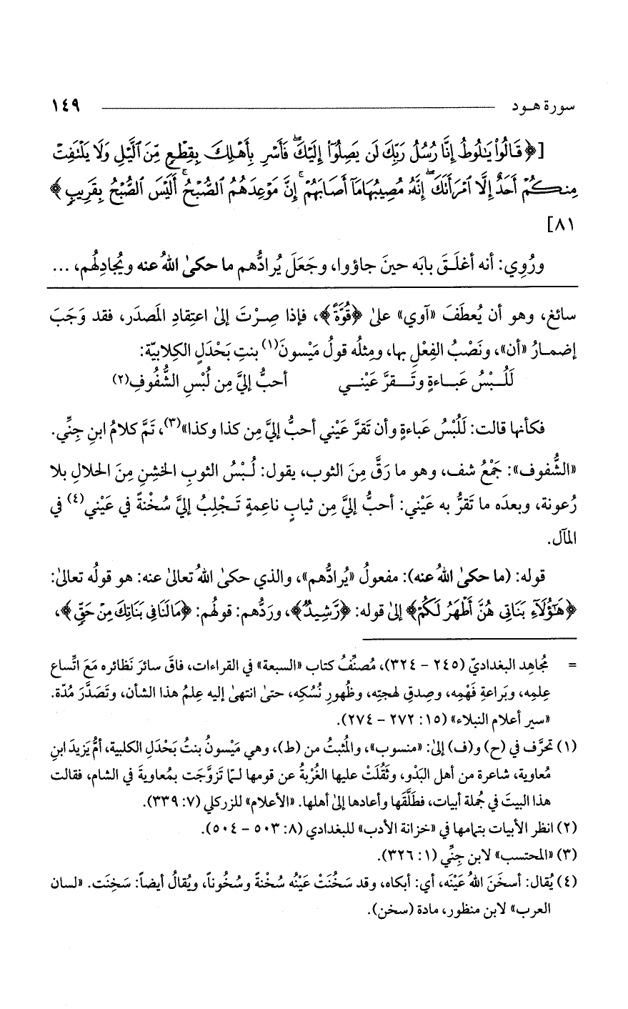 فكأنها قالت: للبس عباءة وأن تقر عيني أحب إلي من كذا وكذا"، تم كلام ابن جني. "الشفوف": جمع شف، وهو ما رق من الثوب، يقول: لبس الثوب الخشن من الحلال بلا رعونة، وبعده ما تقر به عيني: أحب إلي من ثياب ناعمة تجلب إلي سخنة في عيني في المآل.