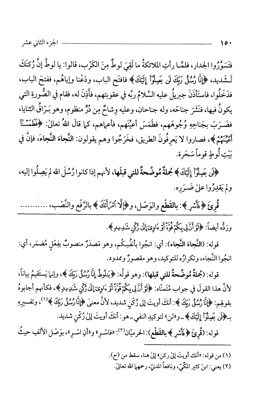 قوله: (جملة موضحة للتي قبلها): وهو قوله: (يَا لُوطُ إِنَّا رُسُلُ رَبِّكَ)، وإنما يستقيم بياناً، لأن هذا القول في جواب متمناه: (لَوْ أَنَّ لِي بِكُمْ قُوَّةً أَوْ آوِي إِلَى رُكْنٍ شَدِيدٍ)، فكأنهم أجابوه بقولهم: (إِنَّا رُسُلُ رَبِّكَ)، وتفسيره بـ (لَنْ يَصِلُوا إِلَيْكَ) - و"لن" لتوكيد النفي- هو: أنك أويت إلى ركن شديد.