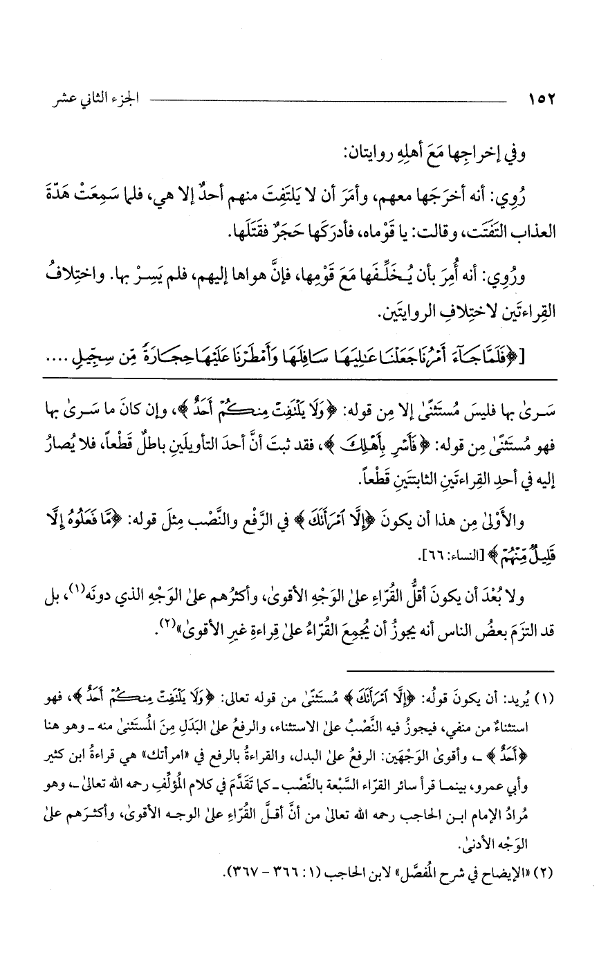 سرى بها فليس مستثنى إلا من قوله: (وَلا يَلْتَفِتْ مِنْكُمْ أَحَدٌ)، وإن كان ما سرى بها فهو مستثنى من قوله: (فَأَسْرِ بِأَهْلِكَ)، فقد ثبت أن أحد التأويلين باطل قطعاً، فلا يصار إليه في أحد القراءتين الثابتتين قطعاً.