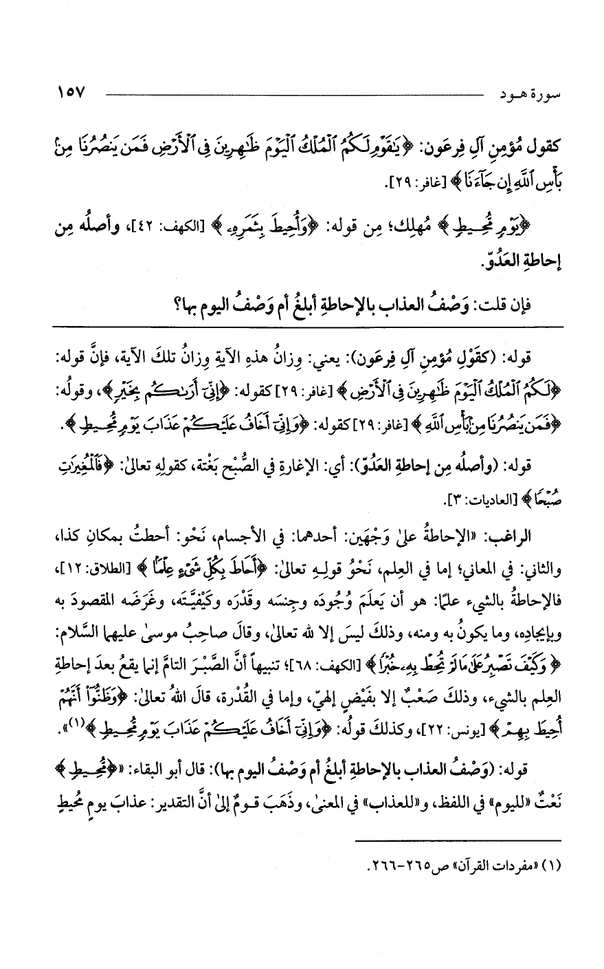 الراغب: "الإحاطة على وجهين: أحدهما: في الأجسام، نحو: أحطت بمكان كذا، والثاني: في المعاني؛ إما في العلم، نحو قوله تعالى: (أَحَاطَ بِكُلِّ شَيْءٍ عِلْماً) [الطلاق: 12]، فالإحاطة بالشيء علماً: هو أن يعلم وجوده وجنسه وقدره وكيفيته، وغرضه المقصود به وبإيجاده، وما يكون به ومنه، وذلك ليس إلا لله تعالى، وقال صاحب موسى عليهما السلام: (وَكَيْفَ تَصْبِرُ عَلَى مَا لَمْ تُحِطْ بِهِ خُبْراً) [الكهف: 68]؛ تنبيهاً أن الصبر التام إنما يقع بعد إحاطة العلم بالشيء، وذلك صعب إلا بفيض إلهي، وإما في القدرة، قال الله تعالى: (وَظَنُّوا أَنَّهُمْ أُحِيطَ بِهِمْ) [يونس: 22]، وكذلك قوله: (وَإِنِّي أَخَافُ عَلَيْكُمْ عَذَابَ يَوْمٍ مُحِيطٍ) ".