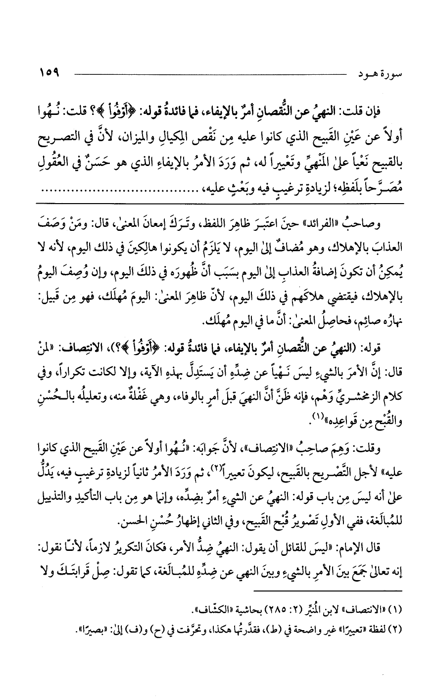 قوله: (النهي عن النقصان أمر بالإيفاء، فما فائدة قوله: (أَوْفُوا)؟ )، الانتصاف: "لمن قال: إن الأمر بالشيء ليس نهياً عن ضده أن يستدل بهذه الآية، وإلا لكانت تكراراً، وفي كلام الزمخشري وهم، فإنه ظن أن النهي قبل أمر بالوفاء، وهي غفلة منه، وتعليله بالحسن والقبح من قواعده".