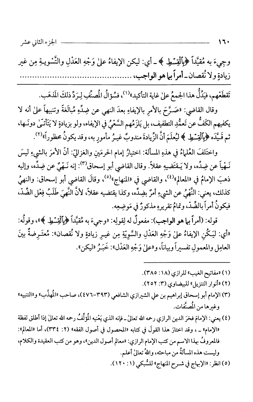 وقال القاضي: "صرح بالأمر بالإيفاء بعد النهي عن ضده مبالغة وتنبيهاً على أنه لا يكفيهم الكف عن تعمد التطفيف، بل يلزمهم السعي في الإيفاء، ولو بزيادة لا يتأتى دونها، ثم قيده (بِالْقِسْطِ) ليعلم أن الزيادة مندوب غير مأمور به، وقد يكون محظوراً".