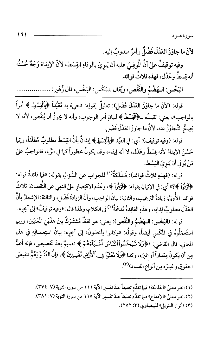 قوله: (فهذه ثلاث فوائد): فذلكة للجواب عن السؤال بقوله: "فما فائدة قوله: (أَوْفُوا)؟ " أي: في الإتيان بقوله: (أَوْفُوا)، وعدم الاقتصار على النهي عن النقصان: ثلاث فوائد: الأولى: زيادة الترغيب، والثانية: بيان الواجب، وأن الزيادة فضل، والثالثة: الإشعار بأن العدل مطلوب لذاته، وهذه الفائدة مدمجة في الكلام، ولهذا قال: "وفيه توقيف" إلى آخره.