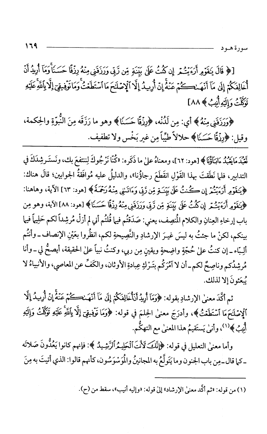 نَعْبُدَ مَا يَعْبُدُ آبَاؤُنَا) [هود: 62]، ومعناه على ما ذكره: "كنا نرجوك لننتفع بك، ونسترشدك في التدابير، فلما نطقت بهذا القول انقطع رجاؤنا"، والدليل عليه موافقة الجوابين؛ قال هناك: (يَا قَوْمِ أَرَأَيْتُمْ إِنْ كُنتُ عَلَى بَيِّنَةٍ مِنْ رَبِّي وَآتَانِي مِنْهُ رَحْمَةً) [هود: 63] الآية، وها هنا: (يَا قَوْمِ أَرَأَيْتُمْ إِنْ كُنتُ عَلَى بَيِّنَةٍ مِنْ رَبِّي وَرَزَقَنِي مِنْهُ رِزْقاً حَسَناً) [هود: 88] الآية، وهو من باب إرخاء العنان والكلام المنصف، يعني: صدقتم فيما قلتم أني لم أزل مرشداً لكم حليماً فيما بينكم، لكن ما جئت به ليس غير الإرشاد والنصيحة لكم، انظروا بعين الإنصاف- وأنتم ألباء- إن كنت على حجة واضحة ويقين من ربي، وكنت نبياً على الحقيقة، أيصح لي- وأنا مرشدكم وناصح لكم- أن لا آمركم بترك عبادة الأوثان، والكف عن المعاصي، والأنبياء لا يبعثون إلا لذلك.