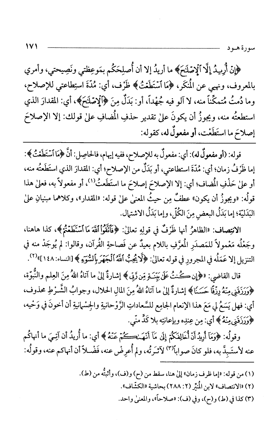 (إِنْ أُرِيدُ إِلَّا الْإِصْلاحَ) ما أريد إلا أن أصلحكم بموعظتى ونصيحتي وأمري بالمعروف ونهي عن المنكر (مَا اسْتَطَعْتُ) ظرف، أي: مدّة استطاعتي للإصلاح، وما دمت متمكناً منه لا آلو فيه جهداً. أو: بدل من (الإصلاح)، أي: المقدار الذي استطعته منه. ويجوز أن يكون على تقدير حذف المضاف على قولك: إلا الإصلاح إصلاح ما استطعت، أو مفعول له كقوله: