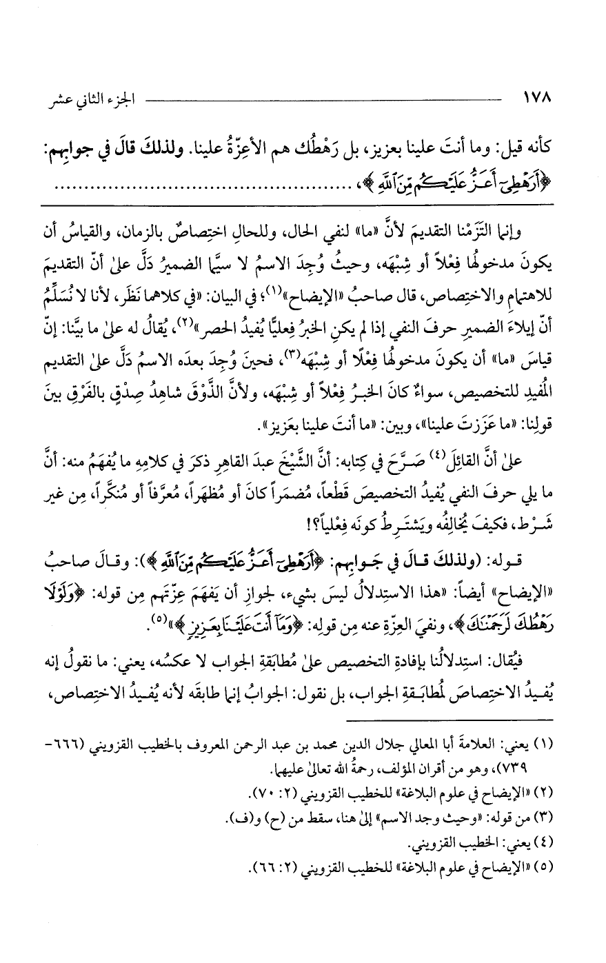 وإنما التزمنا التقديم لأن "ما" لنفي الحال، وللحال اختصاص بالزمان، والقياس أن يكون مدخولها فعلاً أو شبهه، وحيث وجد الاسم لا سيما الضمير دل على أن التقديم للاهتمام والاختصاص، قال صاحب "الإيضاح"؛ في البيان: "في كلاهما نظر، لأنا لا نسلم أن إيلاء الضمير حرف النفي إذا لم يكن الخبر فعلياً يفيد الحصر"، يقال له على ما بينا: إن قياس "ما" أن يكون مدخولها فعلاً أو شبهه، فحين وجد بعده الاسم دل على التقديم المفيد للتخصيص، سواء كان الخبر فعلاً أو شبهه، ولأن الذوق شاهد صدق بالفرق بين قولنا: "ما عززت علينا"، وبين: "ما أنت علينا بعزيز".