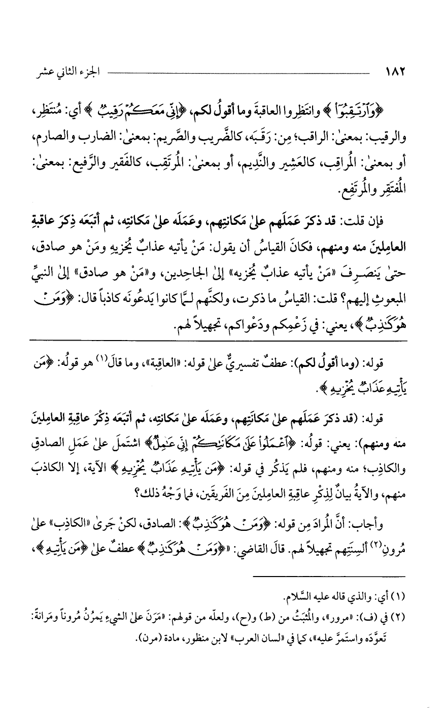 وأجاب: أن المراد من قوله: (وَمَنْ هُوَ كَاذِبٌ): الصادق، لكن جرى "الكاذب" على مرون ألسنتهم تجهيلاً لهم. قال القاضي: " (وَمَنْ هُوَ كَاذِبٌ) عطف على (مَنْ يَأتِيهِ)،