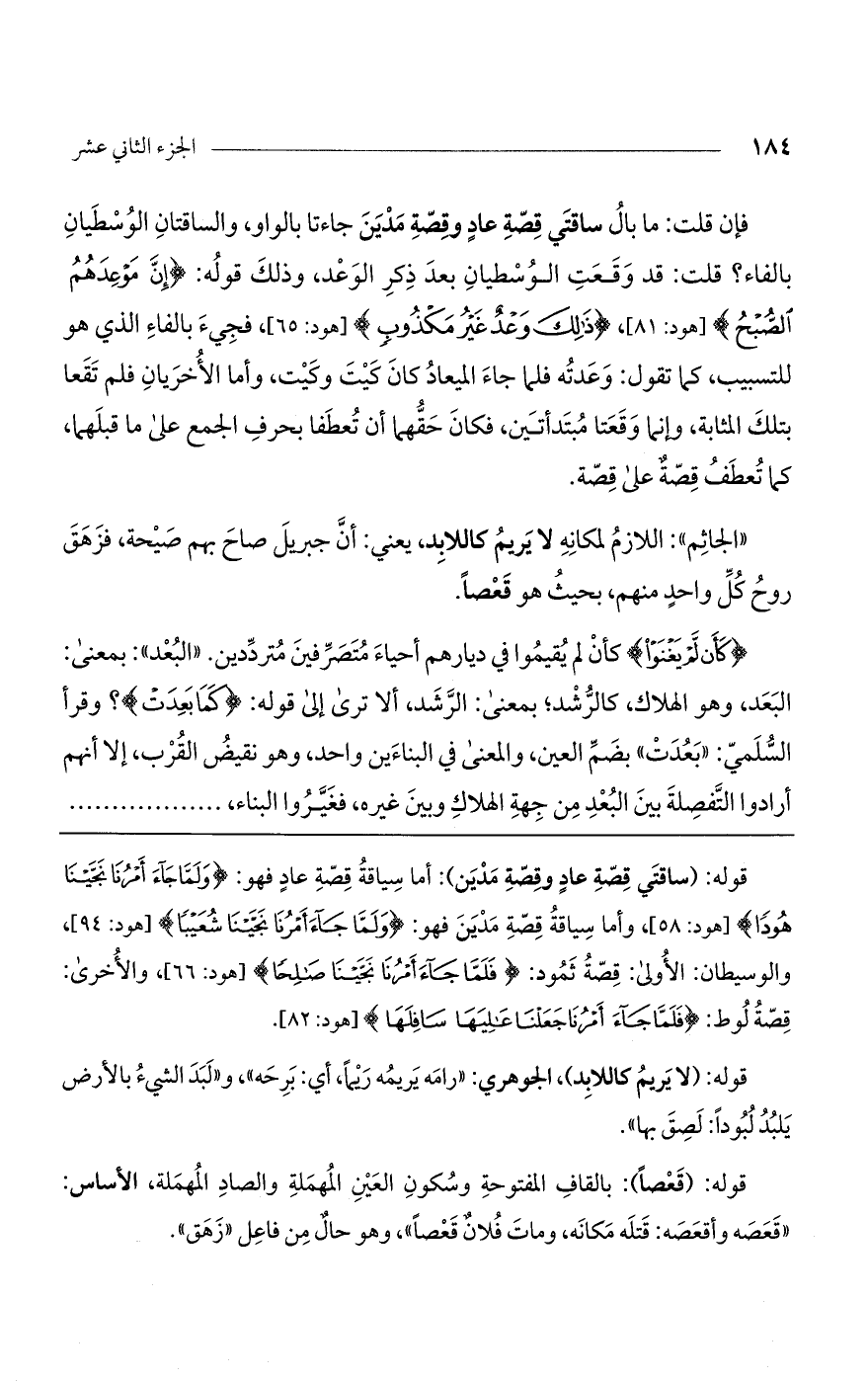فإن قلت: ما بال ساقتي قصة عاد وقصة مدين جاءتا بالواو، والساقتان الوسطيان بالفاء؟ قلت: قد وقعت الوسطيان بعد ذكر الوعد، وذلك قوله (إِنَّ مَوْعِدَهُمُ الصُّبْحُ) [هود: 81]، (ذلِكَ وَعْدٌ غَيْرُ مَكْذُوبٍ) [هود: 65]، فجيء بالفاء الذي هو للتسبيب، كما تقول: وعدته فلما جاء الميعاد كان كيت وكيت. وأما الأخريان فلم تقعا بتلك المثابة. وإنما وقعنا مبتدأتين، فكان حقهما أن تعطفا بحرف الجمع على ما قبلهما كما تعطف قصةٌ على قصة.